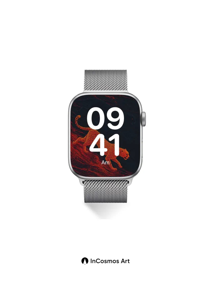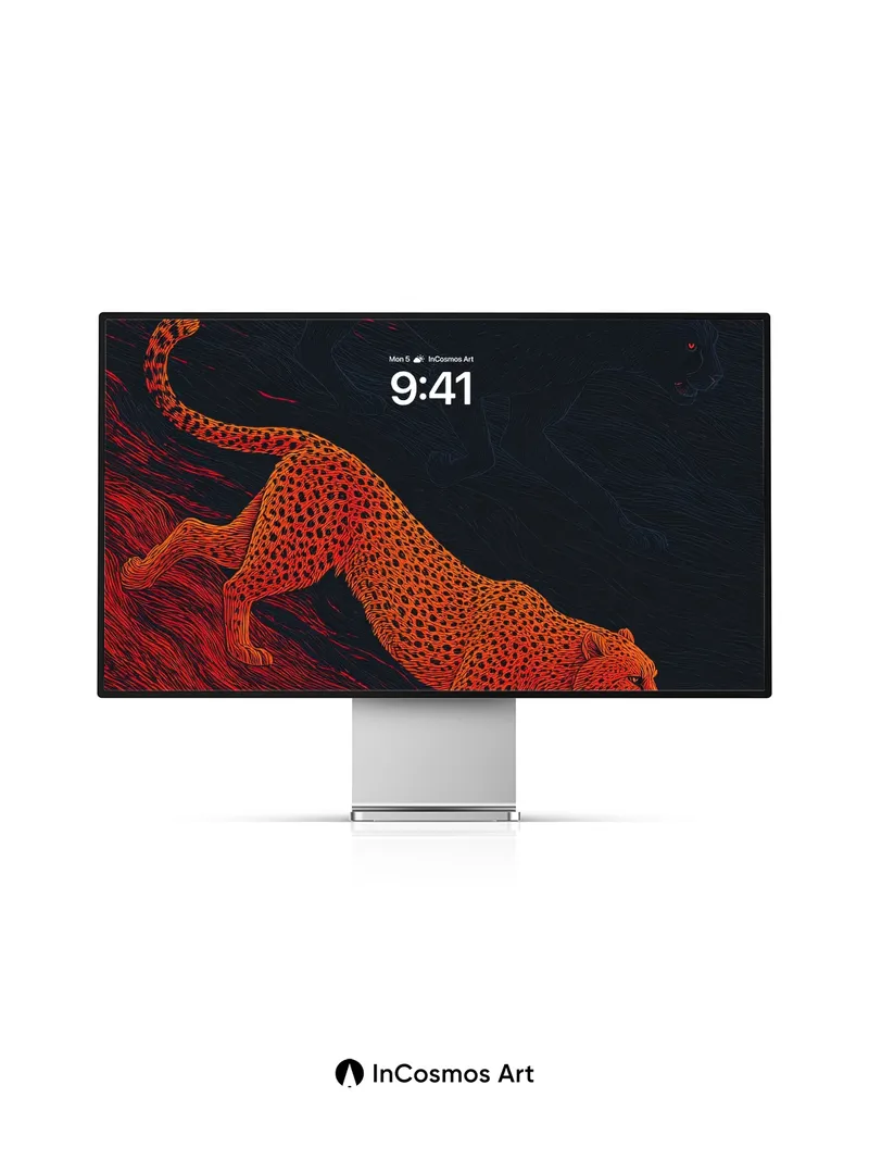 Debug product.metafields.custom.desc: Did you know cheetahs can accelerate from zero to 60 mph in just three seconds? Here, their form blazes across a terrain of molten red lines that pulse like veins beneath dark earth. The animal’s spotted hide glows with an inner fire, while a ghostly silhouette looms behind—silent, watchful, eternal. Light crawls over its muscles as if drawn by hand, each stroke alive with tension and motion.