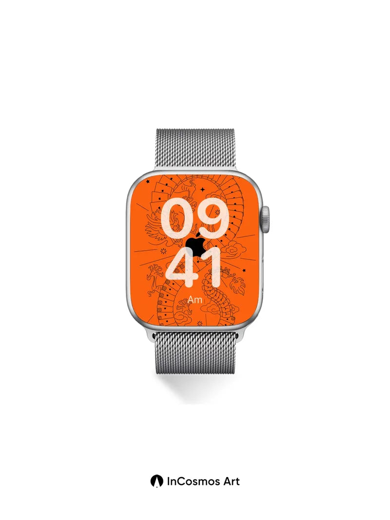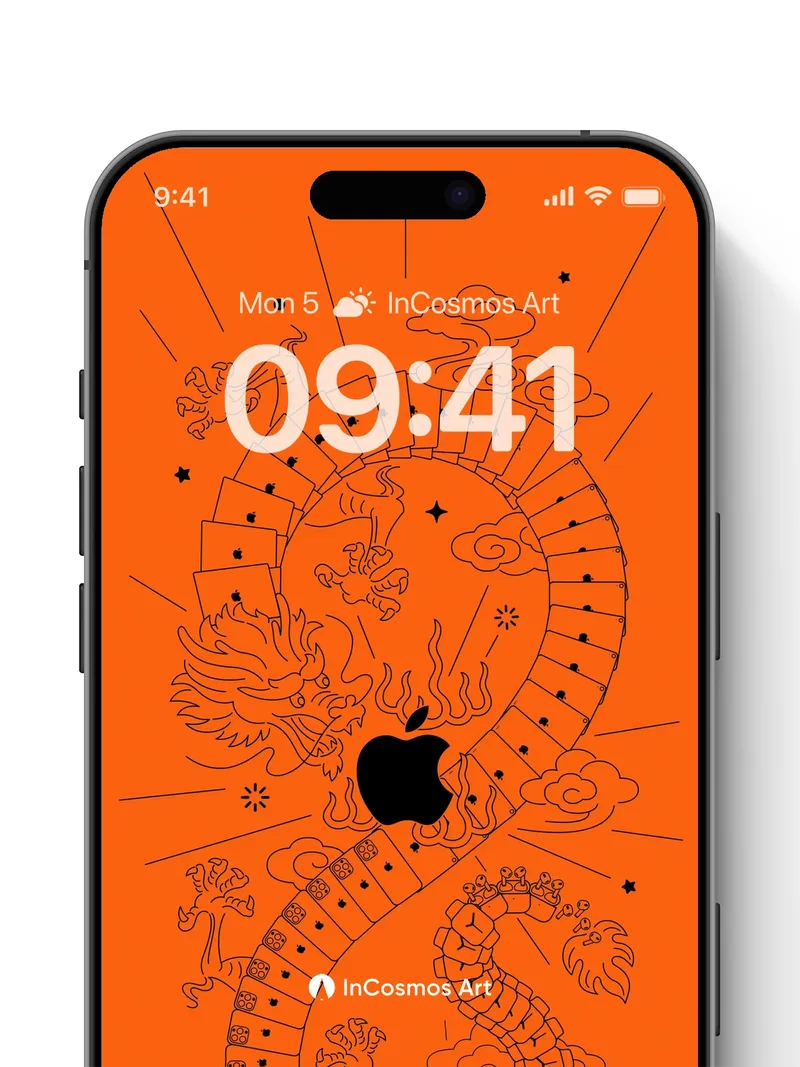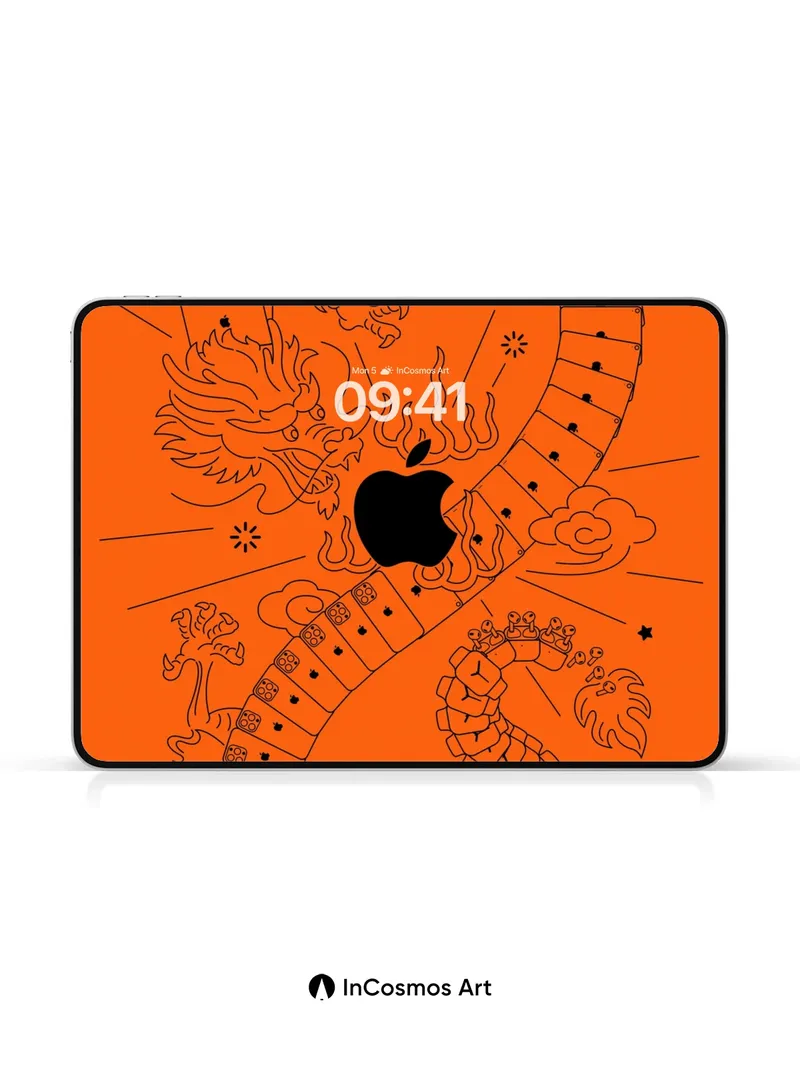 Debug page_description: Did you know the Chinese dragon symbolizes power and good fortune, often depicted coiling through clouds like a celestial serpent? Here, its fiery breath dances across an orange void, each scale etched in black ink as if drawn by ancient hands. The Apple logo rests at its heart—a modern totem fused with myth—while stars flicker like distant sparks. You’re not just seeing a design; you're witnessing a legend reborn in digital form. Share this with your best friend. Send this to your love and swap a matching set. What if every time you unlocked your phone, a myth stirred awake?