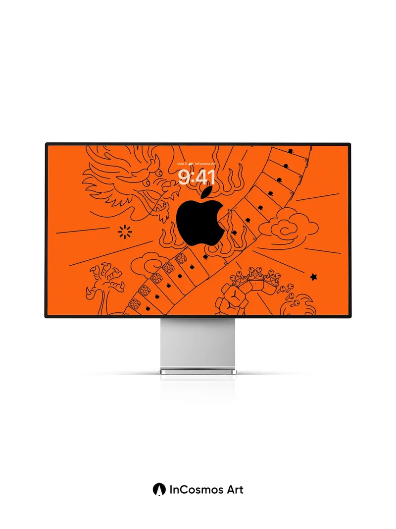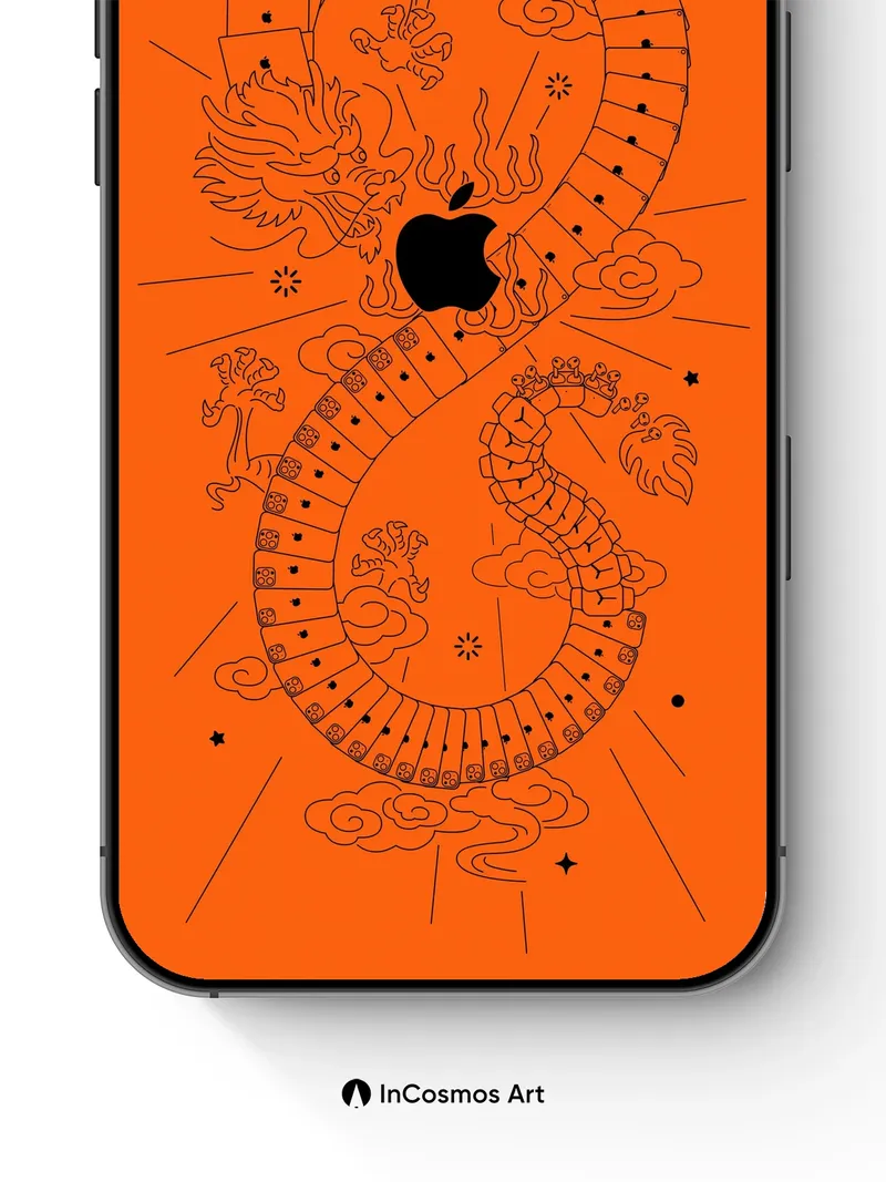 Did you know the Chinese dragon symbolizes power and good fortune, often depicted coiling through clouds like a celestial serpent? Here, its fiery breath dances across an orange void, each scale etched in black ink as if drawn by ancient hands. The Apple logo rests at its heart—a modern totem fused with myth—while stars flicker like distant sparks. You’re not just seeing a design; you're witnessing a legend reborn in digital form.