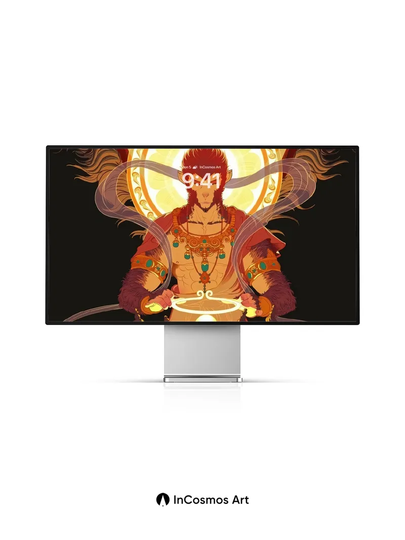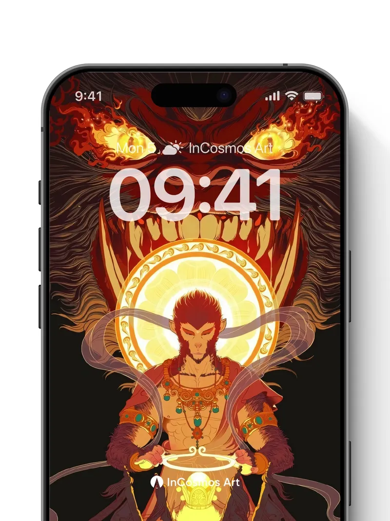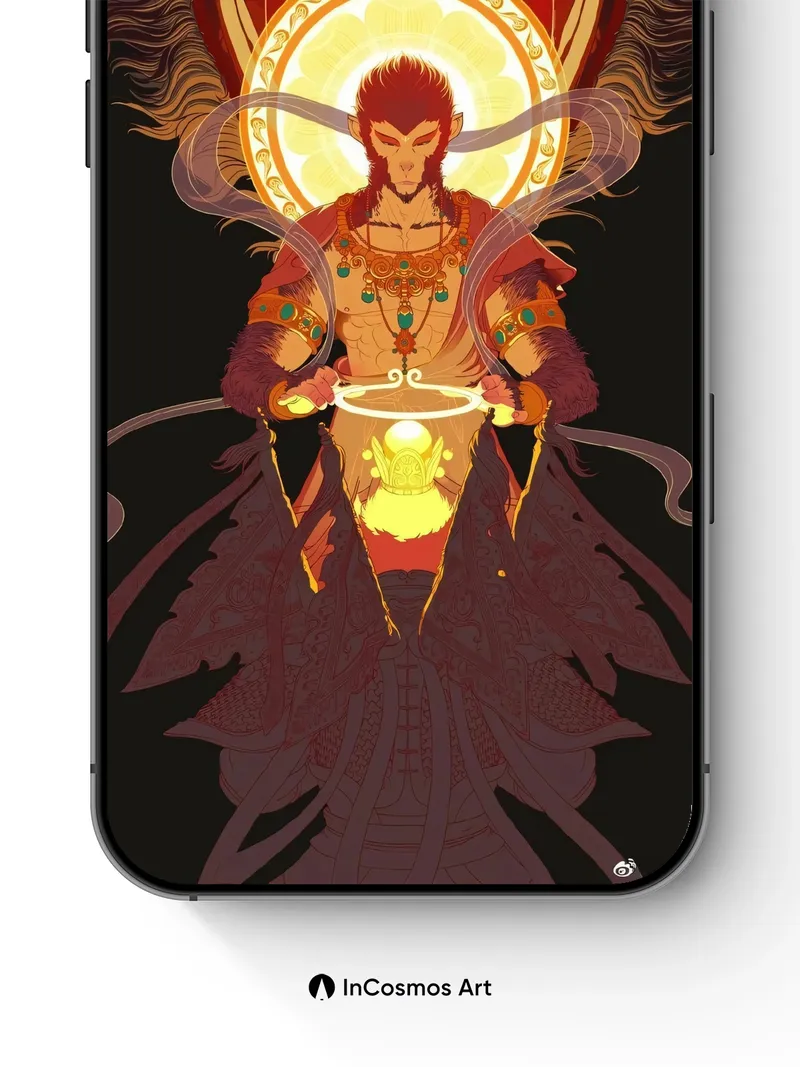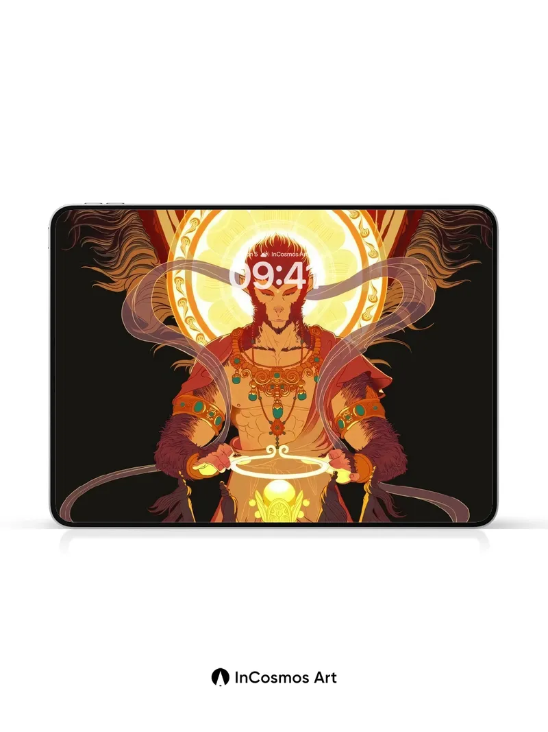 Debug product.metafields.custom.desc: Did you know ancient Chinese myths describe the Monkey King as a celestial being forged in flames and wisdom? Here, he stands beneath a roaring lion-headed deity, light crawling over his golden armor like molten silk, while smoke coils around his form like forgotten prayers. The glow from the lantern he holds pulses with inner fire, illuminating the intricate patterns of his robe and the sacred circle behind him.