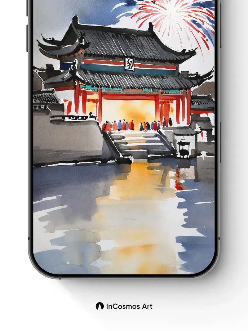 Debug product.metafields.custom.desc: Did you know that traditional Japanese fireworks were once lit to ward off evil spirits? Here, a burst of crimson and white light fractures the night above a serene temple gate, its reflection dancing like liquid gold on still water. You stand at the edge of memory and celebration, where history breathes through every brushstroke and silence sings louder than sound.