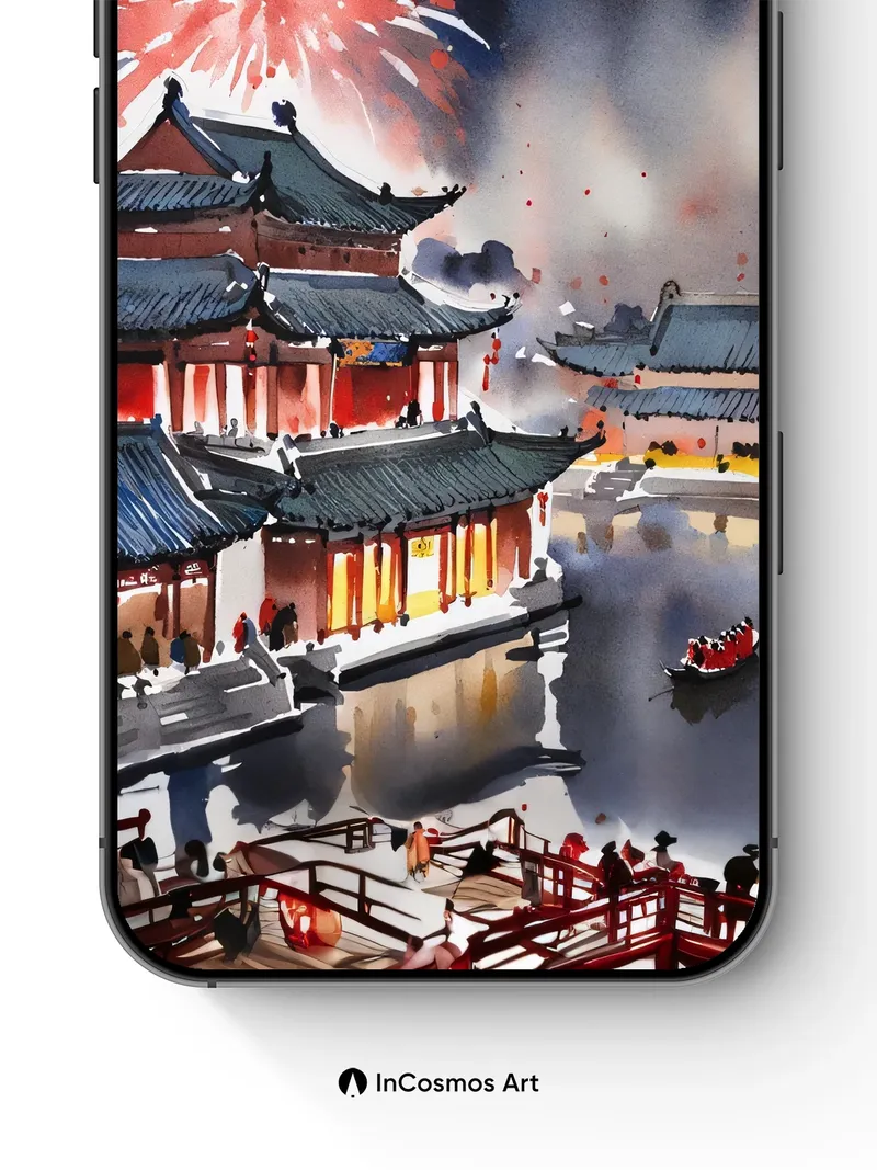 Did you know that ancient Chinese fireworks were first invented to scare away evil spirits? Now, they burst like celestial flowers over rooftops glowing with golden light, their reflections dancing on still water as if time itself paused to watch. You stand on a wooden bridge where red lanterns hum softly in the night air, and every spark feels like a whisper from another world.