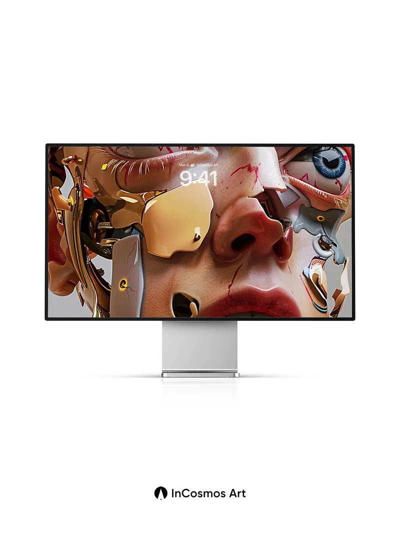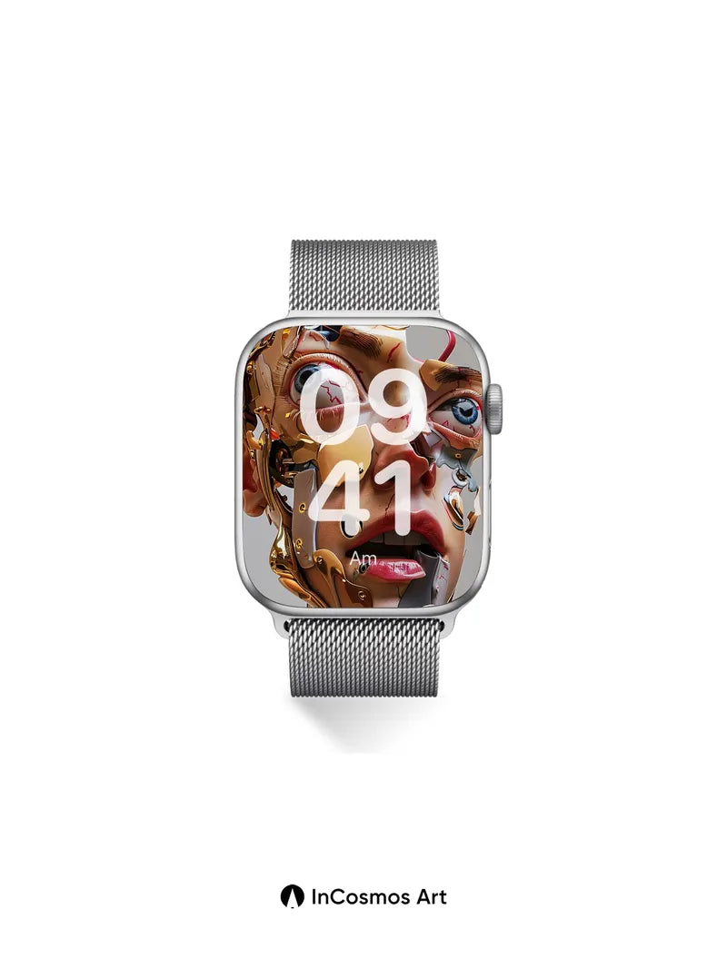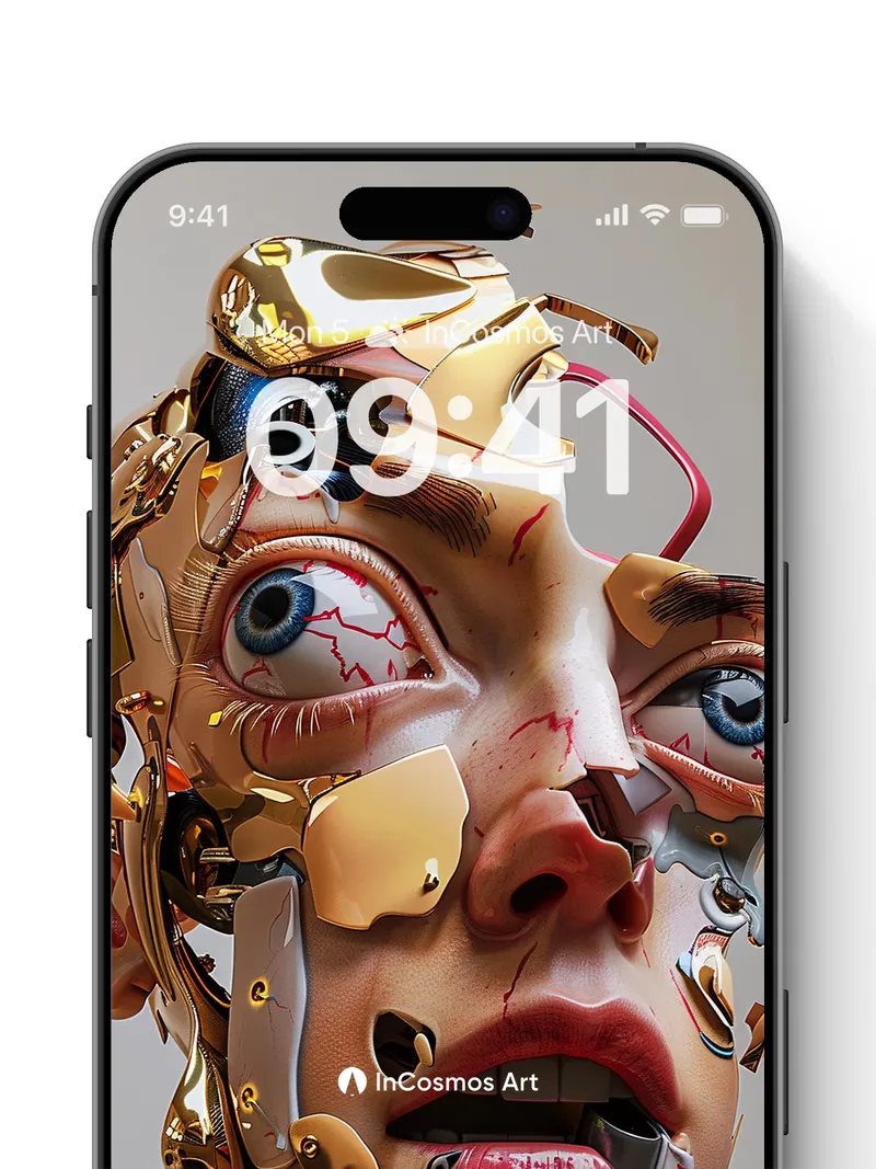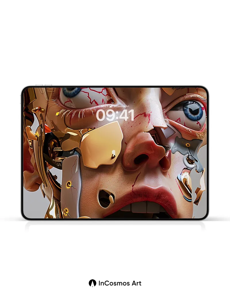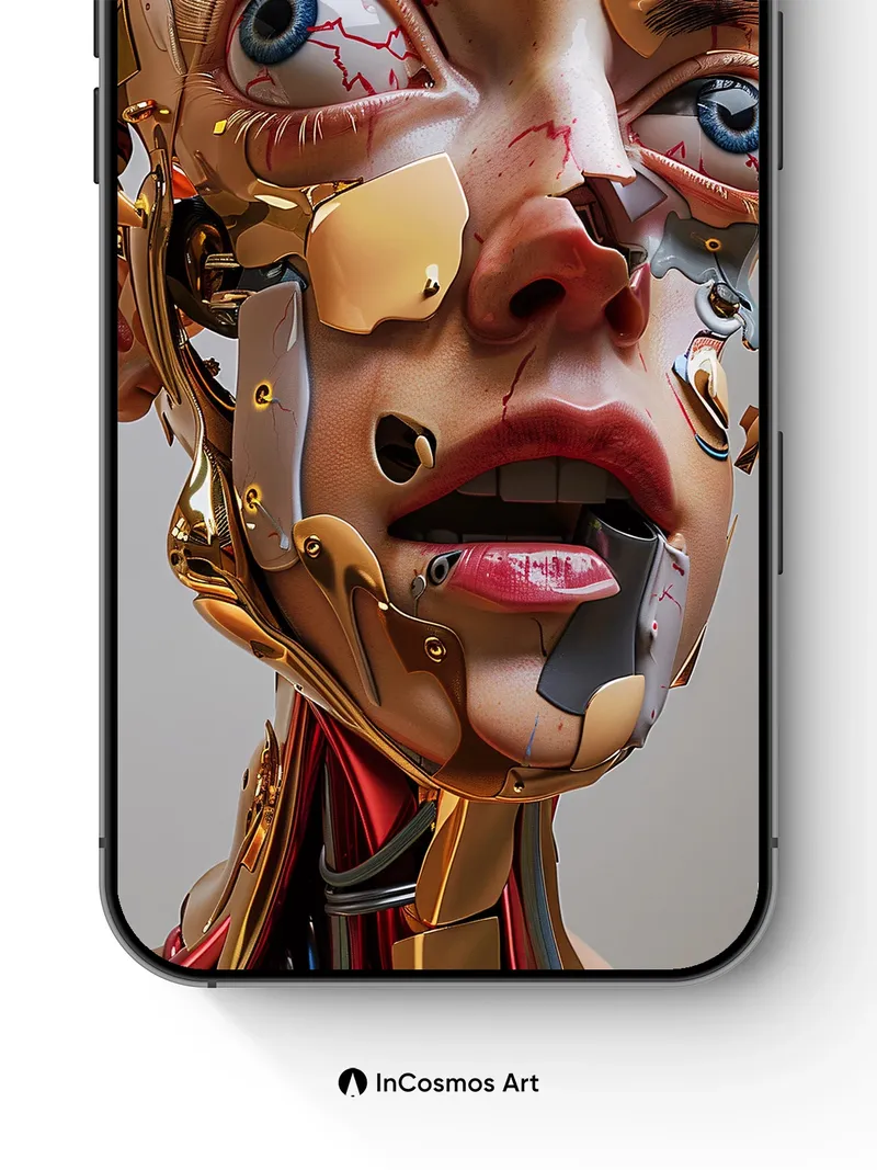 Debug product.metafields.custom.desc: Did you know that in some cybernetic art, gold plating is used to simulate neural pathways? Here, light crawls over shattered skin and molten metal, revealing a face half-mechanical, half-human, where veins of crimson bleed into circuitry. The eyes—wide, electric blue—hold a silent scream beneath layers of brass and flesh, as if consciousness is trapped between code and biology.