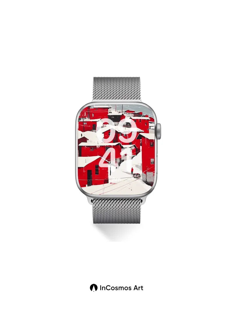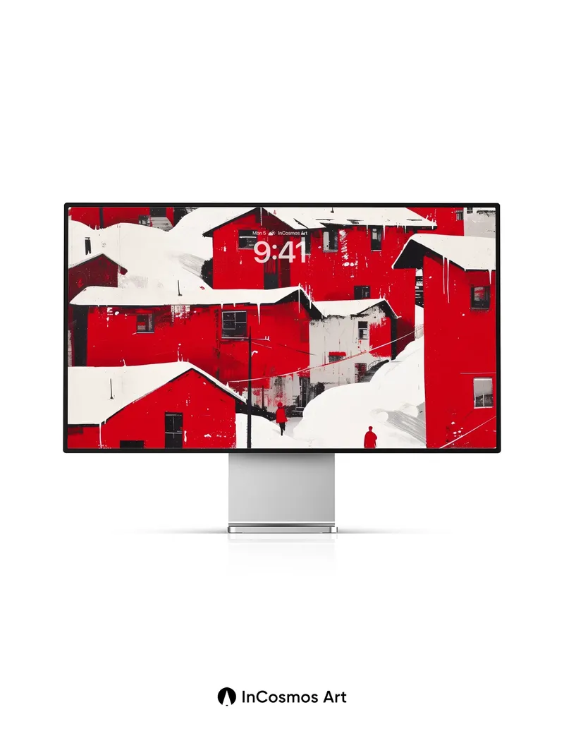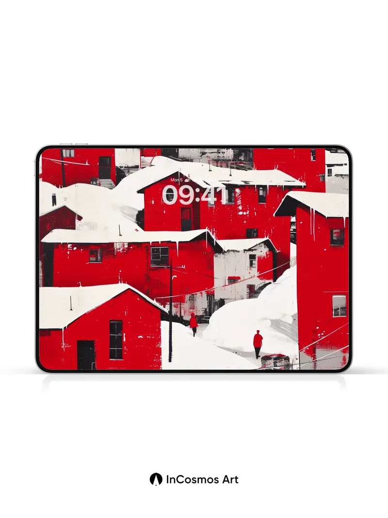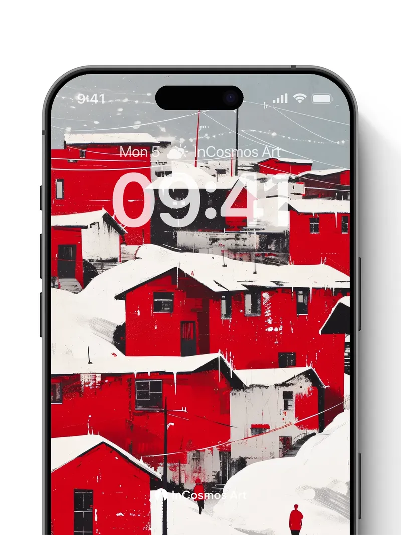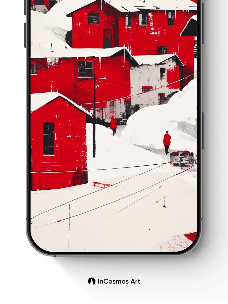 Debug product.metafields.custom.desc: Did you know that in Arctic settlements, red-painted wooden homes absorb more solar heat than darker hues? Snow clings like powdered sugar to every roofline, while icicles hang like frozen harpsichord strings from eaves. Two figures walk through the hush, their red coats echoing the buildings’ bold pulse—each step cracking the silence of a world suspended between warmth and winter’s breath.