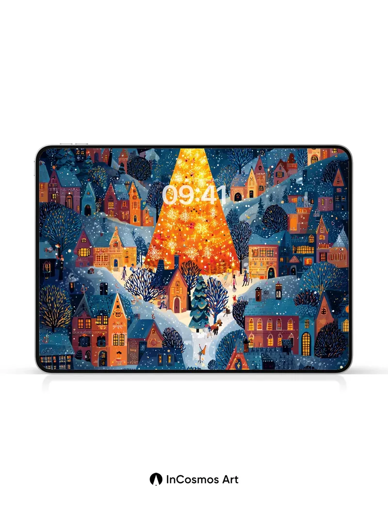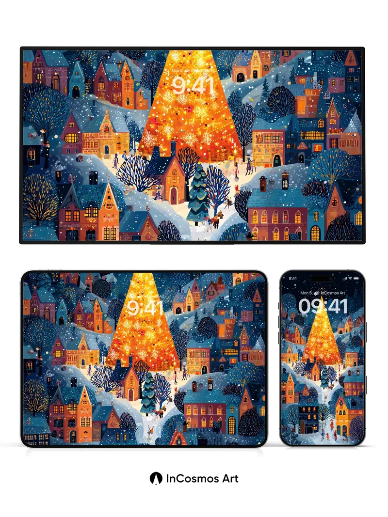 Debug page_description: Did you know snowflakes form unique crystalline patterns in under two seconds? Here, each flake sparkles like a tiny star against the deep indigo sky, while warm amber light spills from windows and climbs the towering Christmas tree, turning it into a beacon of golden fire. The village breathes beneath its winter coat—cobbles glisten with frost, rooftops curl like sleeping cats, and children’s laughter echoes through the stillness. Share this with your best friend. Send this to your love and swap a matching set. What if every snowfall carried a secret only you could hear?