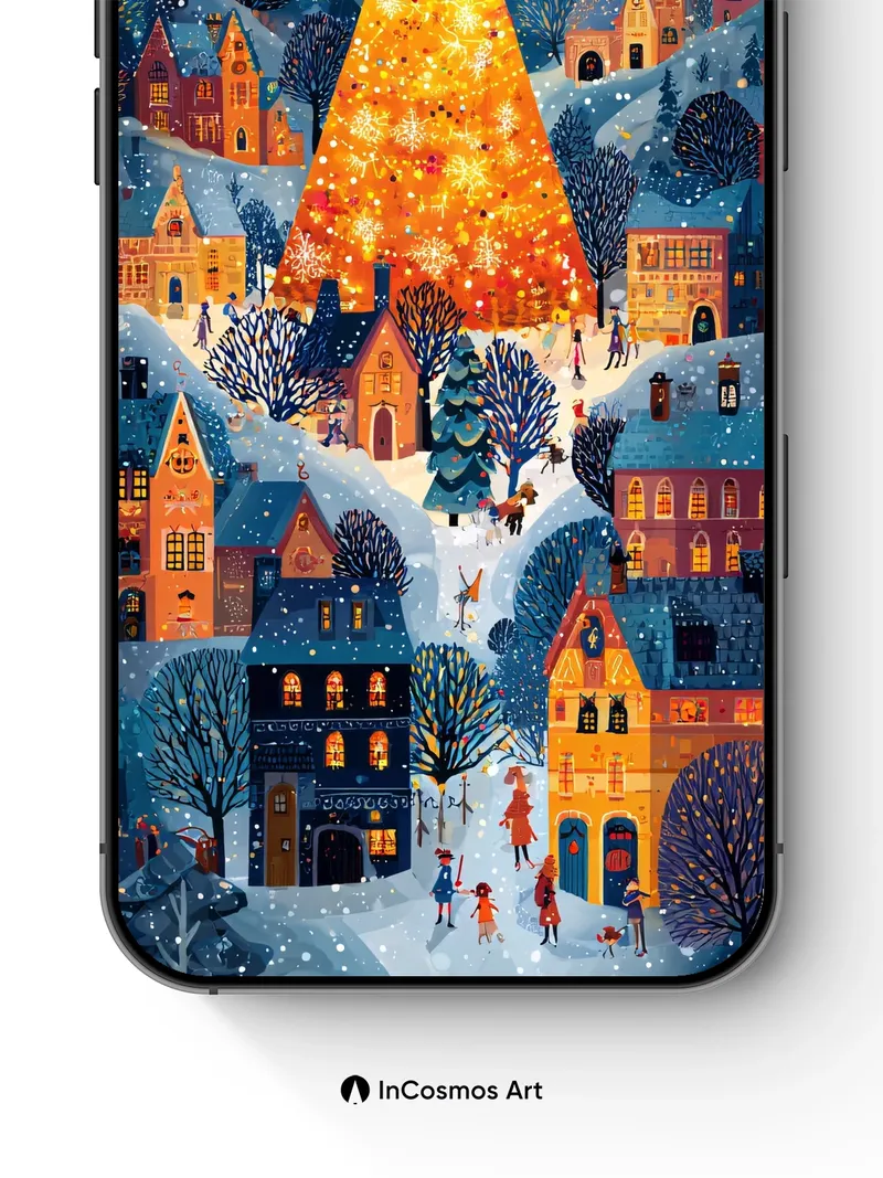 Did you know snowflakes form unique crystalline patterns in under two seconds? Here, each flake sparkles like a tiny star against the deep indigo sky, while warm amber light spills from windows and climbs the towering Christmas tree, turning it into a beacon of golden fire. The village breathes beneath its winter coat—cobbles glisten with frost, rooftops curl like sleeping cats, and children’s laughter echoes through the stillness.