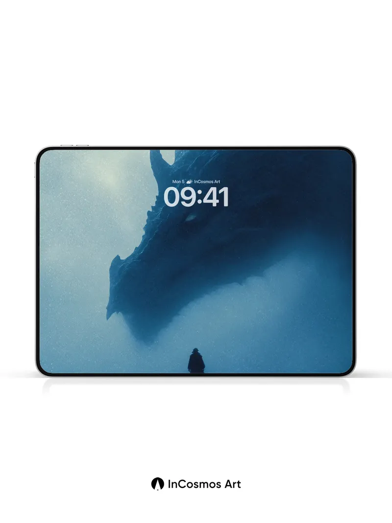 Debug product.metafields.custom.desc: Did you know ice crystals form in fractal patterns that mirror ancient mythic structures? In this frozen expanse, a colossal dragon's silhouette emerges from the mist, its scales like carved glaciers under a dim sky, while a lone figure stands beneath it, cloaked and still. The cold breathes through every curve of the beast, and the air hums with the silence of ages—where legend meets the edge of visibility.