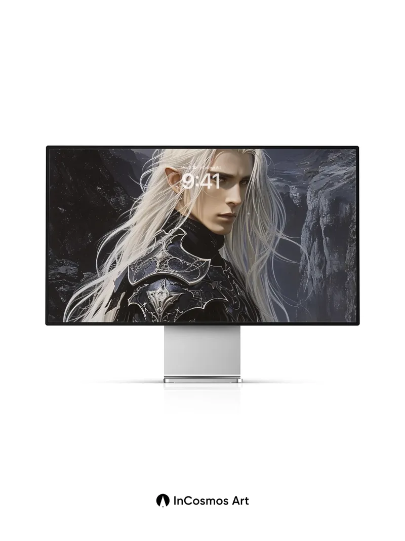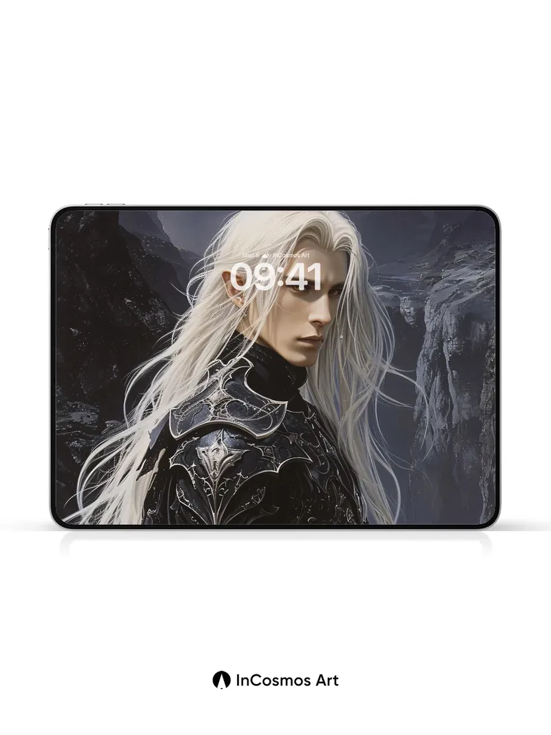 Debug product.metafields.custom.desc: Did you know ancient elves wove their hair from moonlight and frost? This warrior’s silver tresses flow like liquid mercury, catching the last glow of a dying sky as he stands atop jagged cliffs where shadows breathe fire. His armor, carved from obsidian and etched with forgotten runes, reflects no light—only the storm that coils behind him, whispering secrets of realms beyond sight.