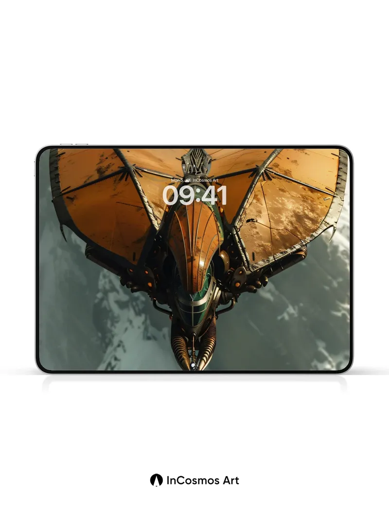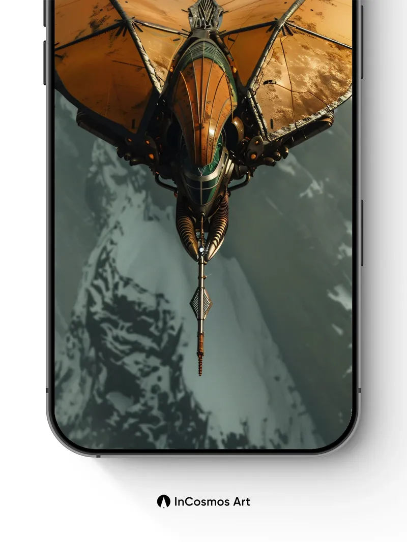 Debug product.metafields.custom.desc: Did you know ancient sky-pilots once believed flying machines were born from mountain spirits? This mechanical winged vessel soars above frozen peaks, its brass frame glowing like molten amber under a hazy sun, while snowdrifts curl like breath in the thin air. You can almost hear the creak of gears and feel the chill of altitude as it glides over jagged ridges, a relic of forgotten flight.