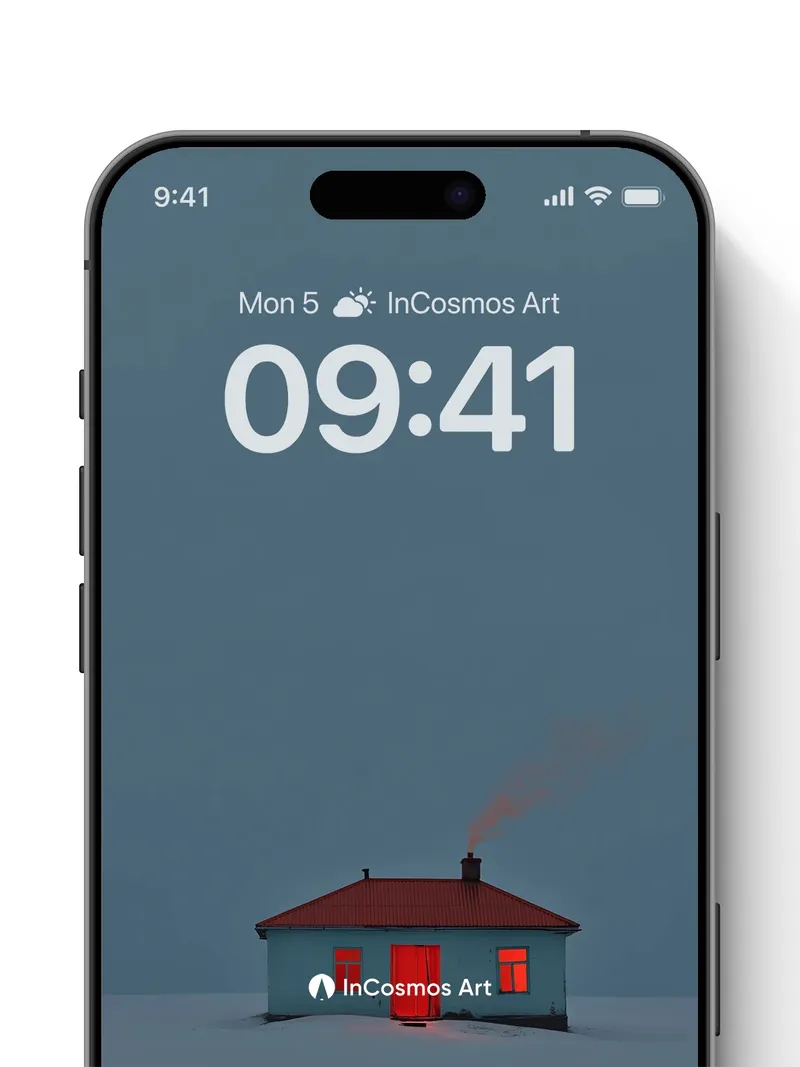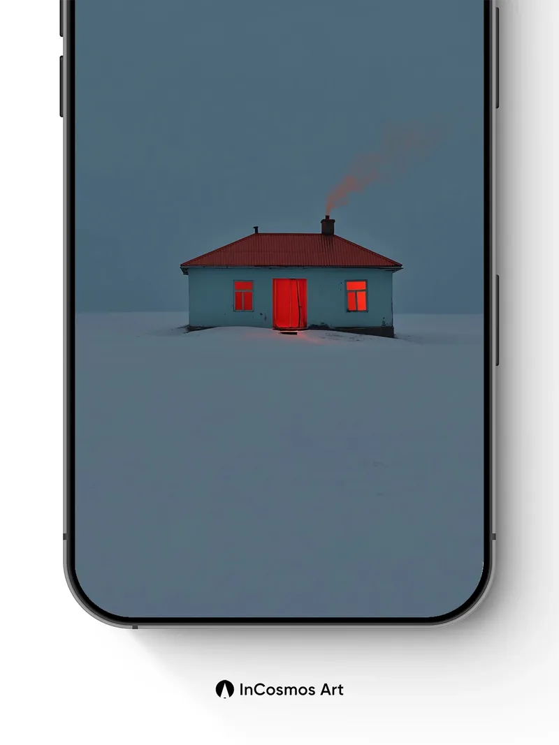 Debug product.metafields.custom.desc: Did you know snow reflects nearly 90% of visible light, making it one of the most luminous surfaces on Earth? Here, that cold brilliance is pierced by a single house glowing with red warmth—its door and windows aglow like embers in a frozen world. The smoke curls upward, a fragile thread between earth and sky, while the snow lies still, untouched, as if holding its breath.