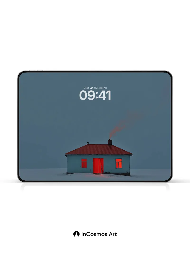 Debug page_description: Did you know snow reflects nearly 90% of visible light, making it one of the most luminous surfaces on Earth? Here, that cold brilliance is pierced by a single house glowing with red warmth—its door and windows aglow like embers in a frozen world. The smoke curls upward, a fragile thread between earth and sky, while the snow lies still, untouched, as if holding its breath. Share this with your best friend. Send this to your love and swap a matching set. What would you leave behind in a house like this?