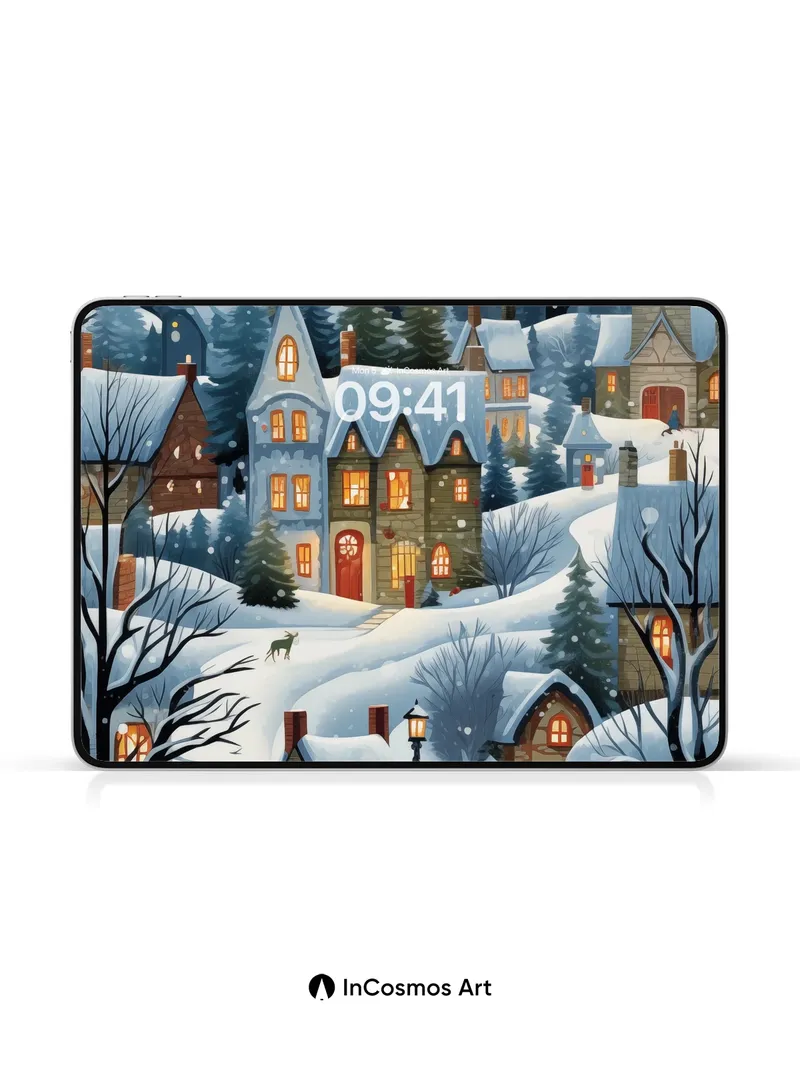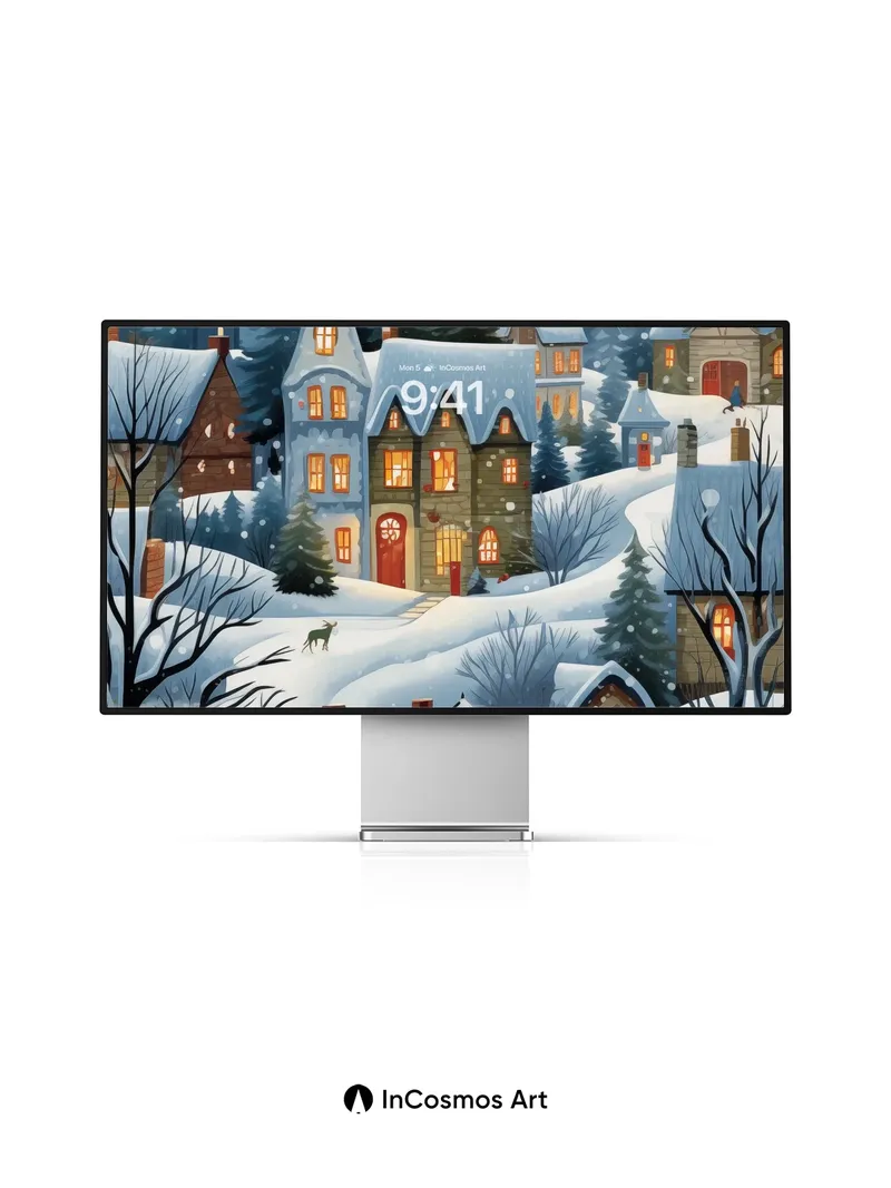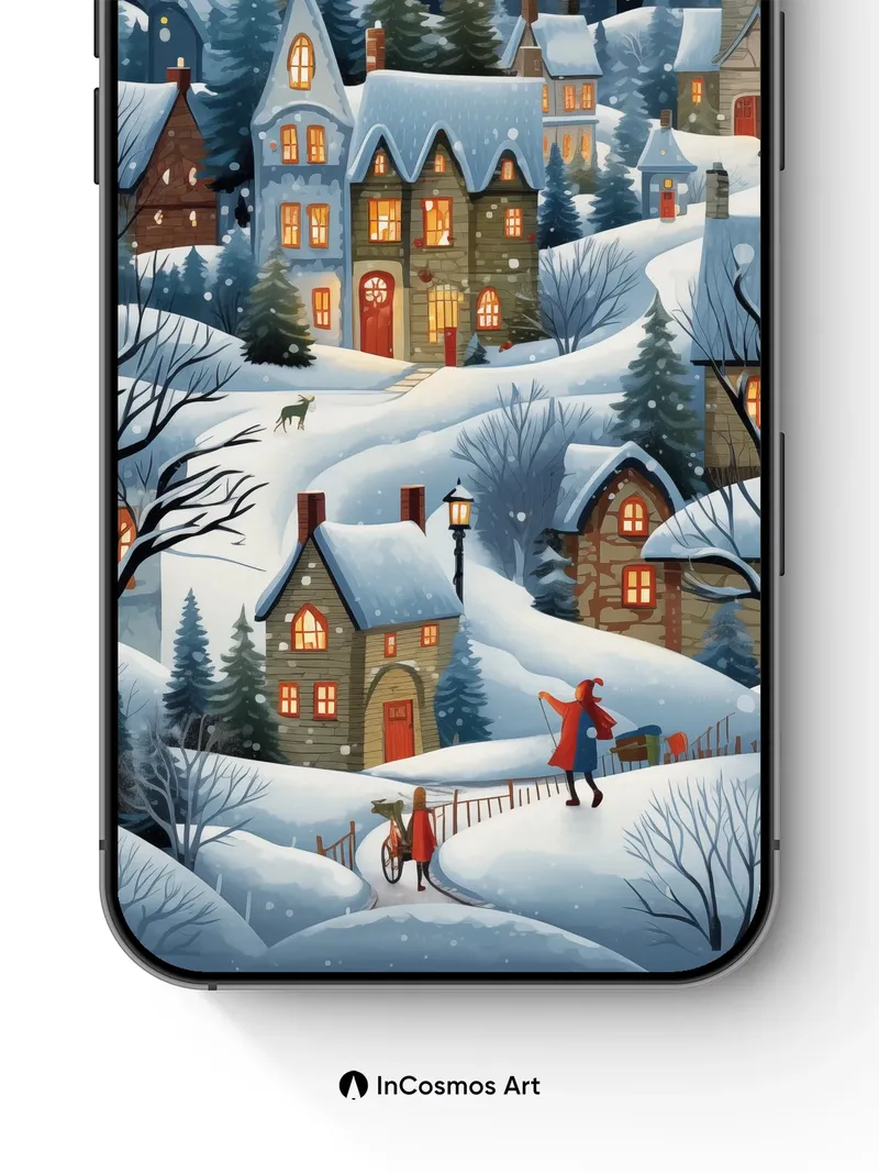 Debug product.metafields.custom.desc: Did you know snowflakes form unique crystalline patterns in temperatures below -15°C, each one a fleeting geometry of ice? In this winter scene, light crawls over snow-draped rooftops like liquid amber, while stars pierce the velvet sky as if breathing fire into the cold. A lone figure in red walks through the hush, their breath curling into the air like smoke from a distant hearth.