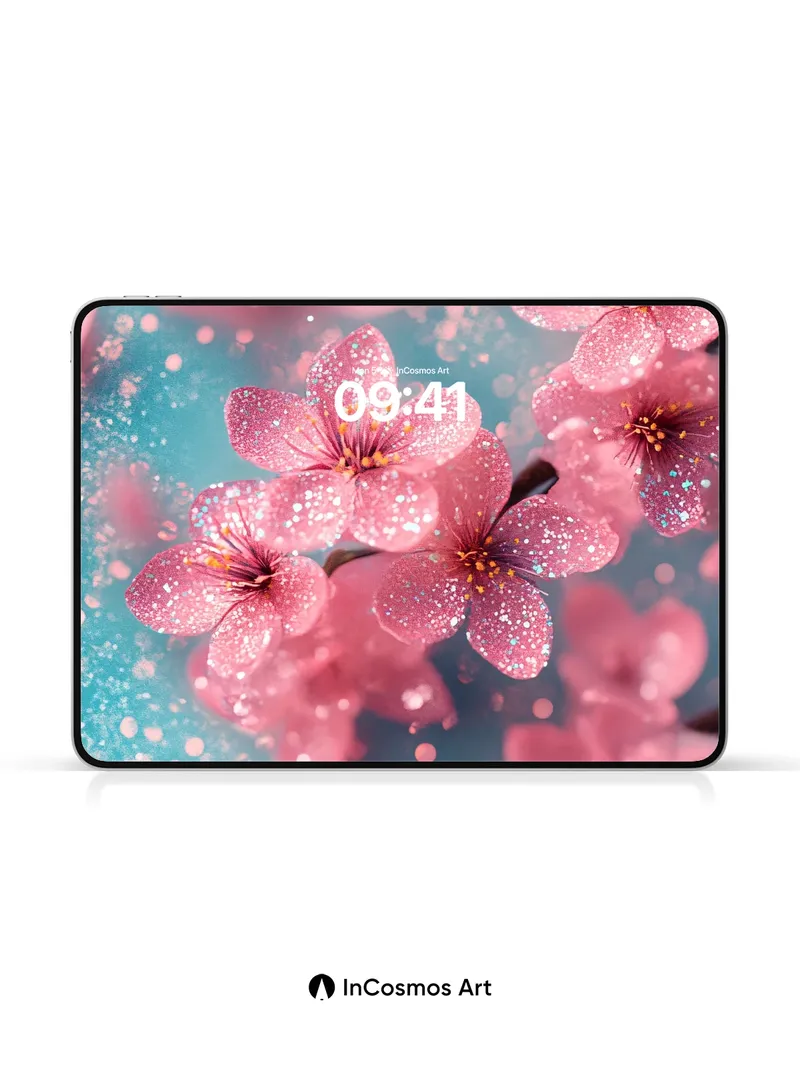Debug page_description: Did you know cherry blossoms in Japan are traditionally seen as fleeting symbols of life’s impermanence? Here, each petal shimmers with stardust-like particles that seem to breathe light into the turquoise void. The soft glow crawls across delicate pink surfaces like dawn over a still lake, while floating fragments dance in slow motion—inviting you to pause and remember how beauty can feel both ephemeral and eternal. Share this with your best friend. Send this to your love and swap a matching set. What if every flower held a universe inside?