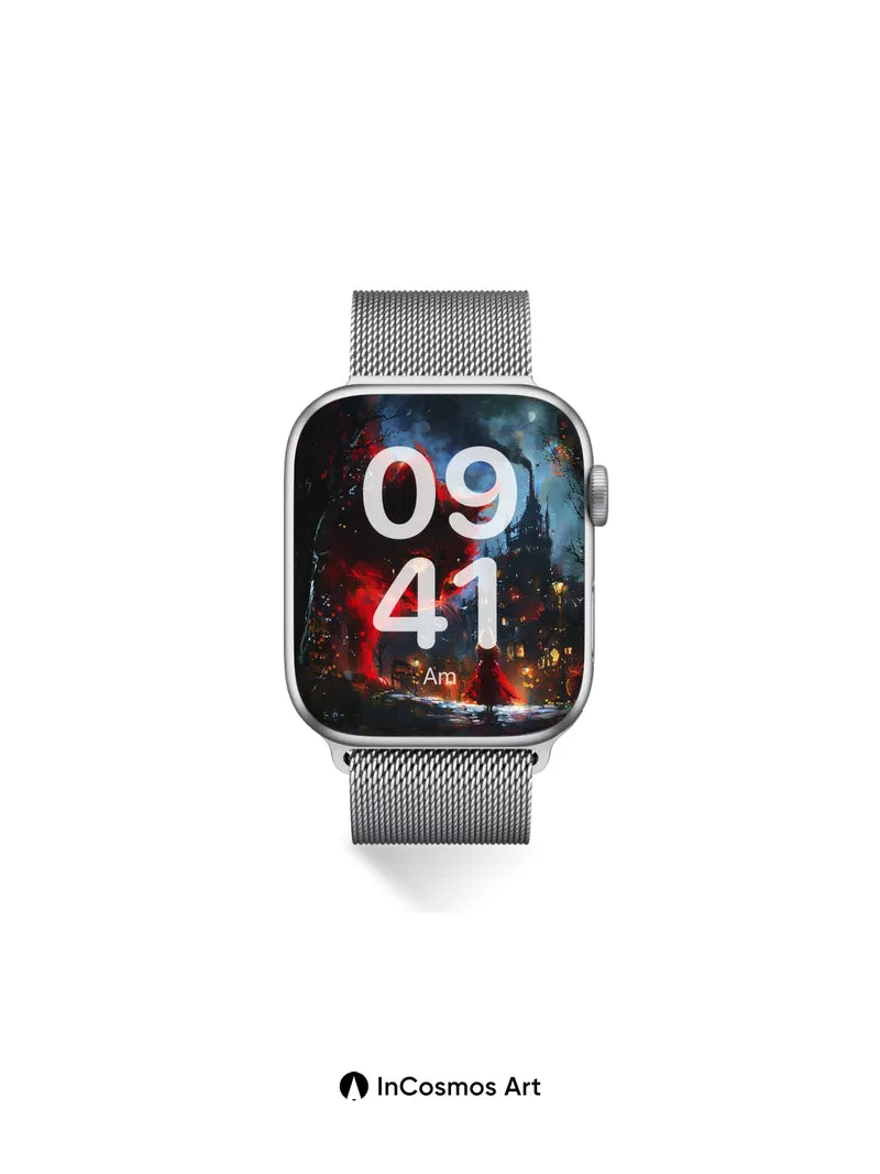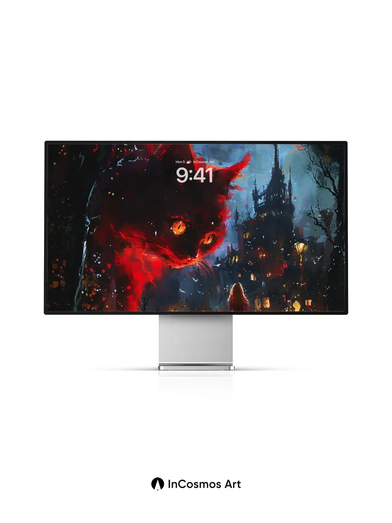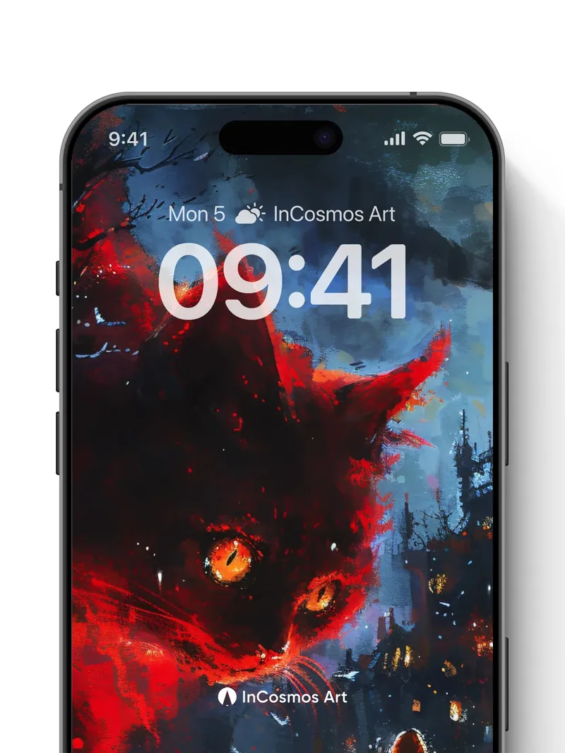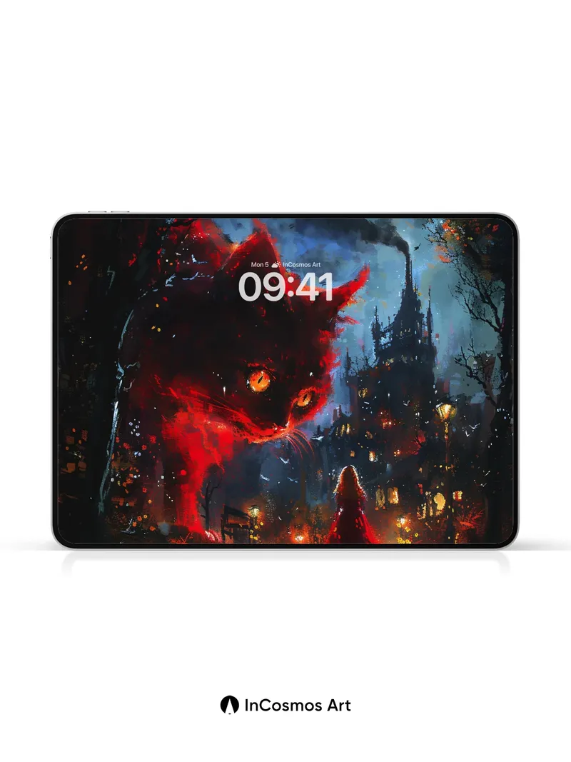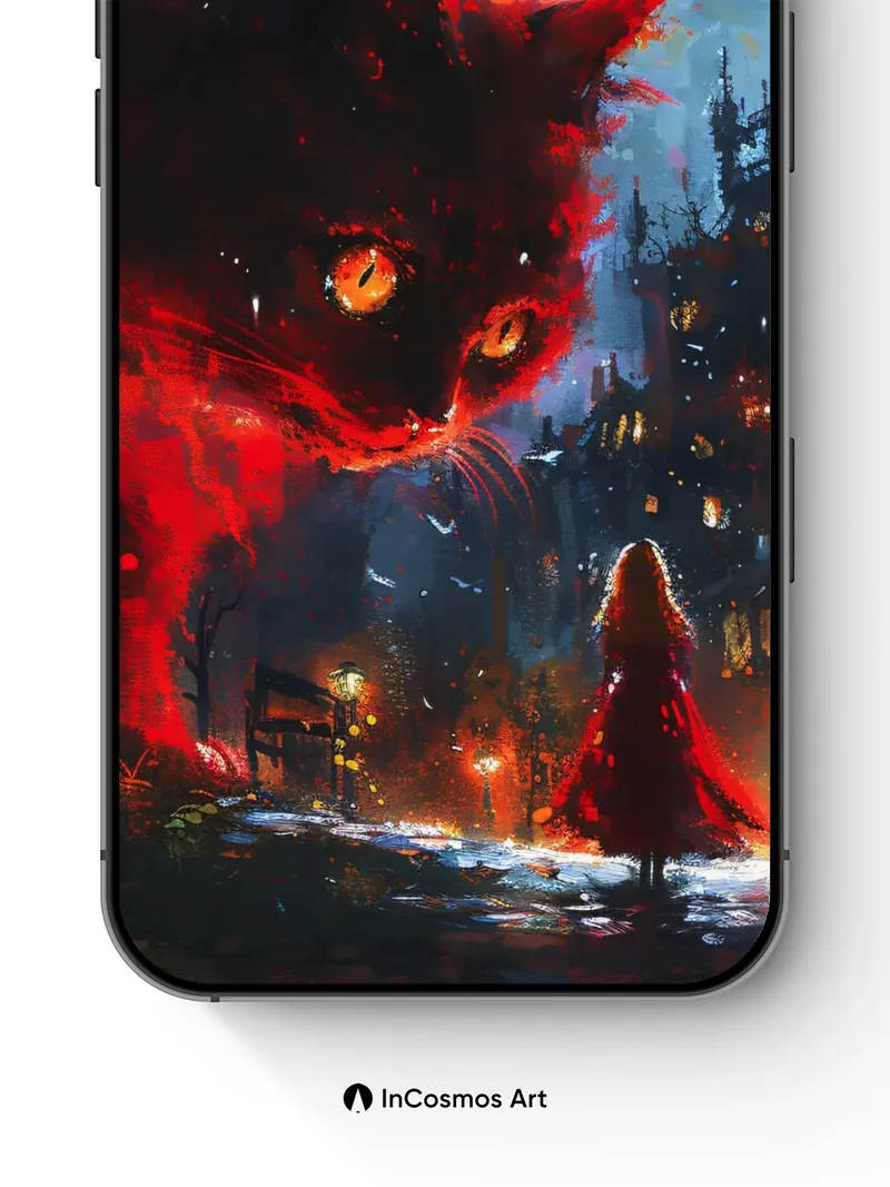 Debug product.metafields.custom.desc: Did you know that in ancient folklore, cats were believed to carry the souls of lost witches? Here, a colossal feline made of molten crimson light watches over a moonlit city where cobblestones reflect like liquid obsidian and lanterns flicker like dying stars. The air hums with quiet dread as a lone figure in red walks toward destiny, their silhouette framed by smoke and shadow.