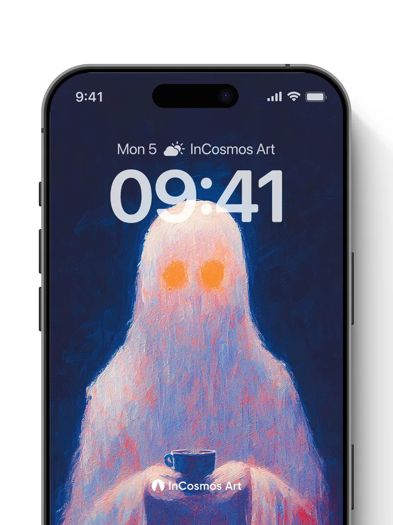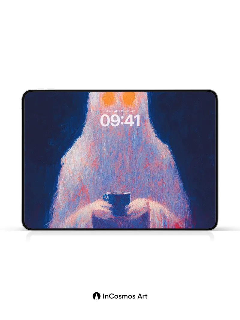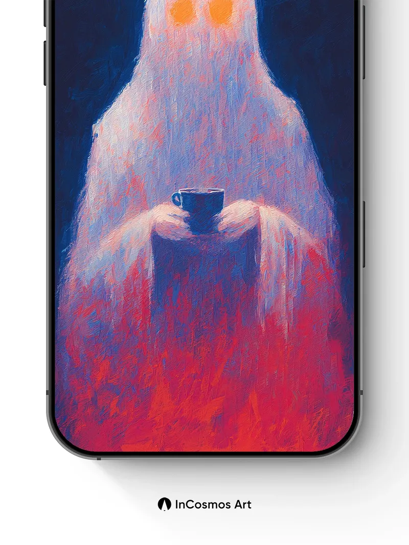 Debug product.metafields.custom.desc: Did you know that in ancient folklore, ghosts were often seen sipping tea at the edge of memory? This spectral figure, draped in luminous fabric like frost on glass, holds a dark cup from which warmth seems to rise into the void. The light crawls over its form—soft, almost breathing—while shadows deepen around it like old secrets. Its eyes burn with quiet fire, not of fear, but of presence.