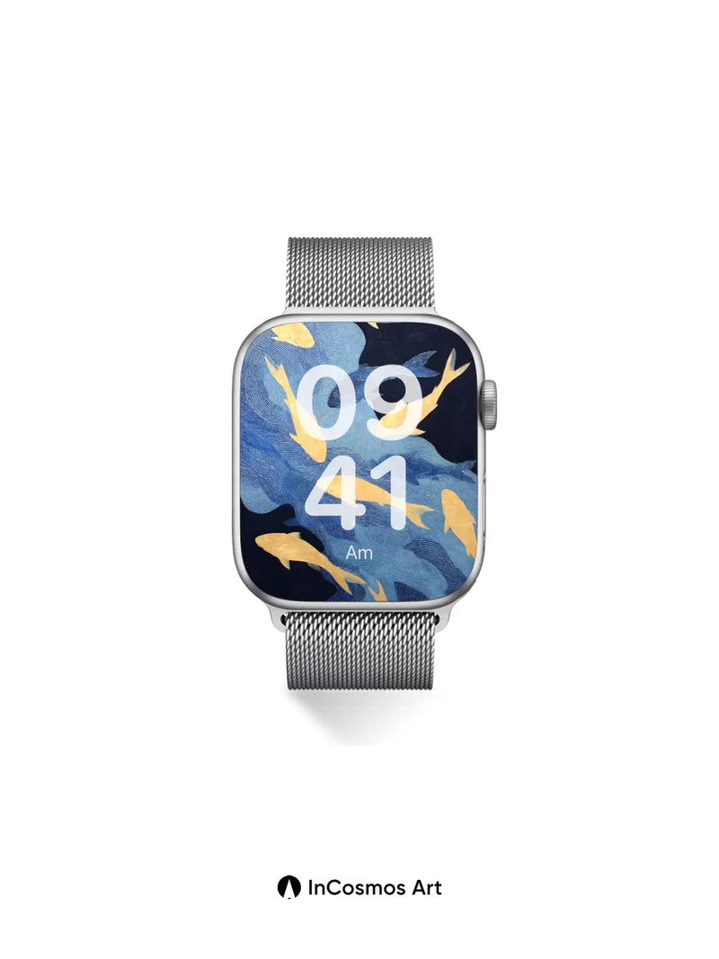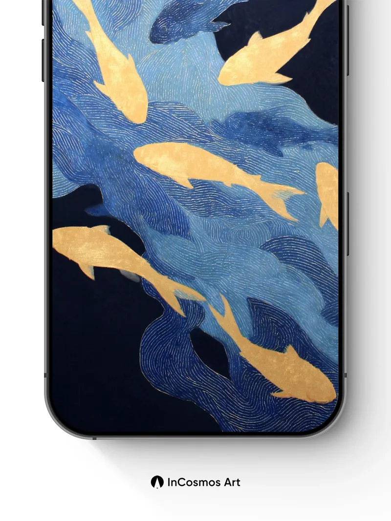 Debug page_description: Did you know ancient Japanese artisans used gold leaf to symbolize divine light in water scenes? Here, luminous fish glide through undulating blue waves that shimmer like hand-pressed silk, their edges catching the glow as if lit from within. The dark void beyond feels alive, breathing with quiet motion—each curve a whispered story of deep currents and hidden paths. Share this with your best friend. Send this to your love and swap a matching set. What would happen if your walls began to swim?
