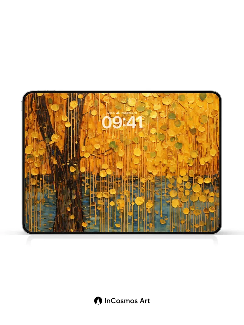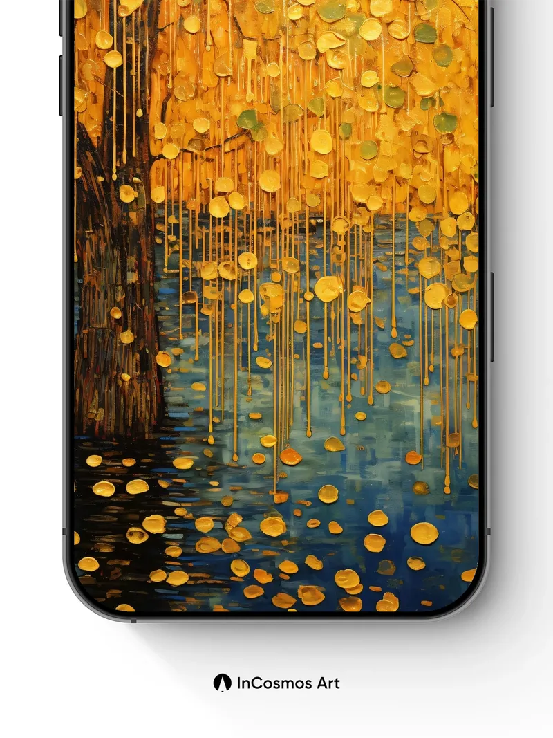 Golden Drip Fantasy Wallpaper with Floating Leaves