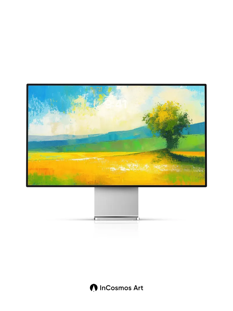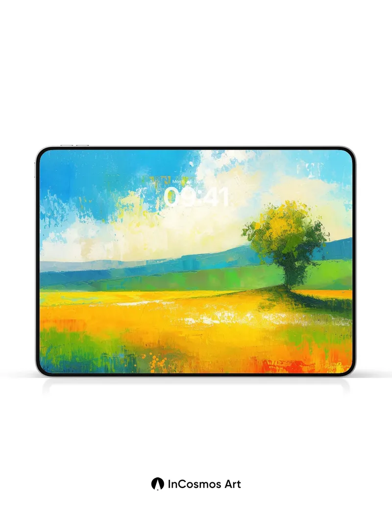 Did you know that Impressionist painters often used thick, visible brushstrokes to capture the fleeting quality of light? Here, color breathes through textured fields where sunlight dances across golden wheat and a lone tree stands like a quiet sentinel. The sky, brushed in layers of cerulean and cloud-white, feels alive—each stroke pulling you into a moment suspended between earth and air.