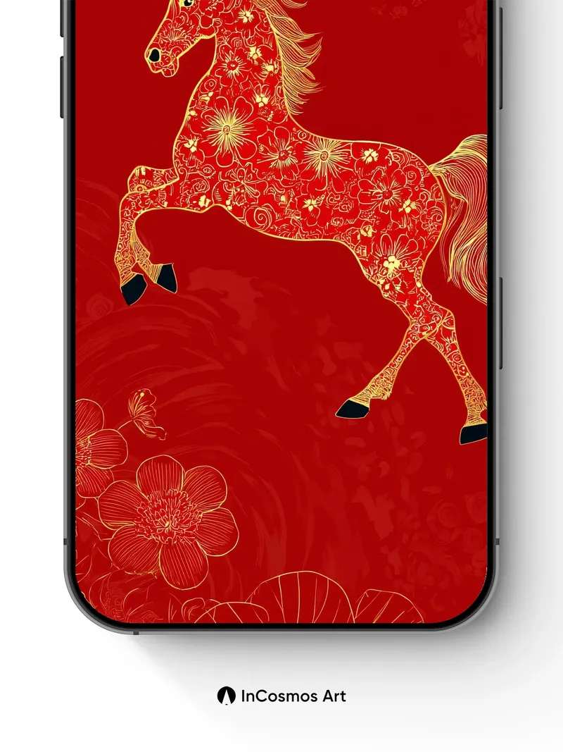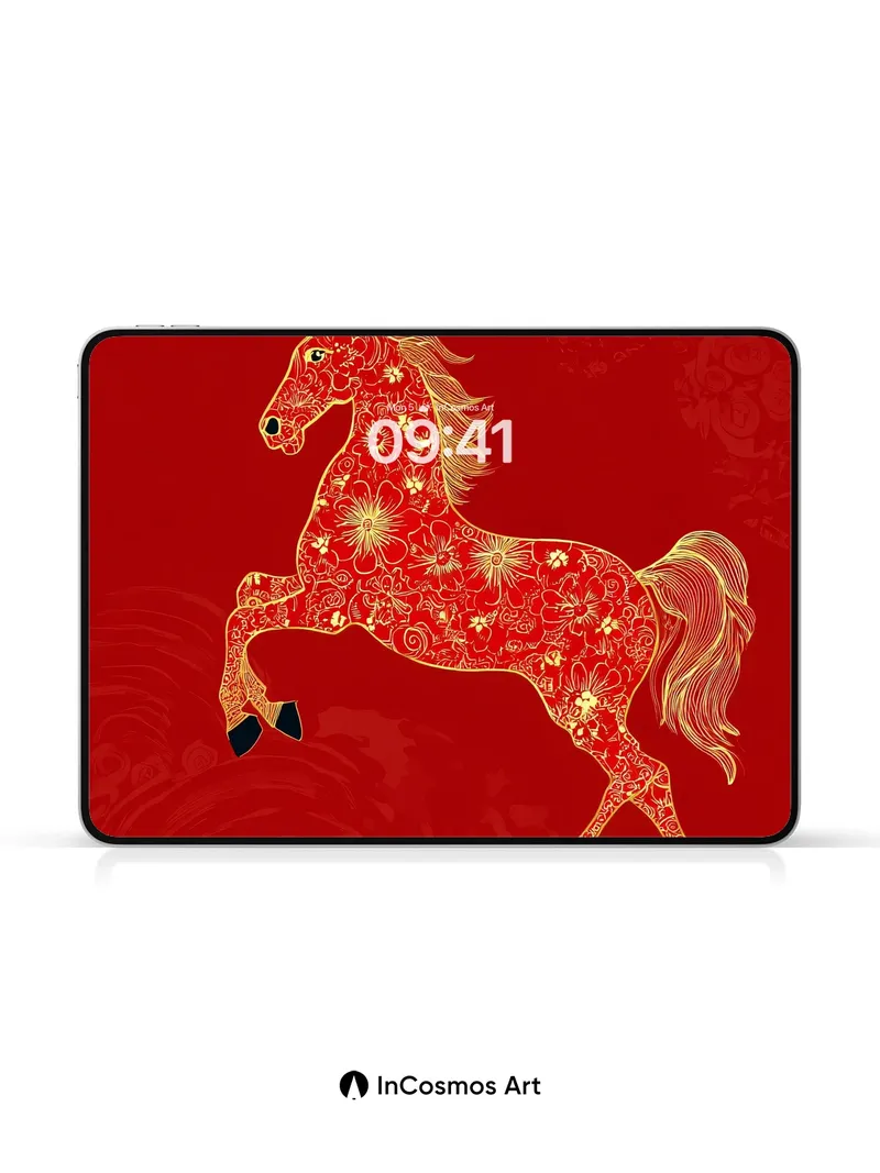 Golden Floral Horse Wallpaper with Red Velvet Depth