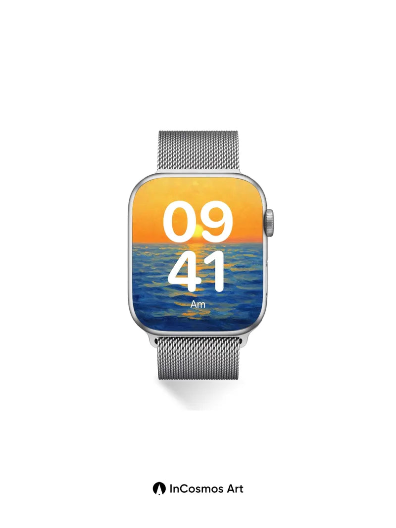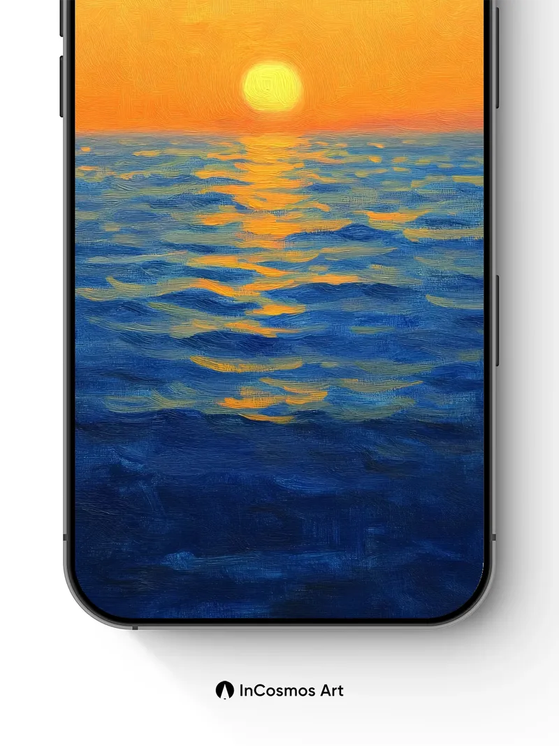 Debug product.metafields.custom.desc: Did you know the ocean reflects sunlight in a way that mimics molten gold, especially at dawn and dusk? This moment captures that liquid fire as it dances across deep cobalt waves, each crest catching firelight like a whispered secret. The sky breathes in layers of amber and peach, while the water below hums with quiet power—still enough to hold the sun’s reflection, restless enough to carry dreams.