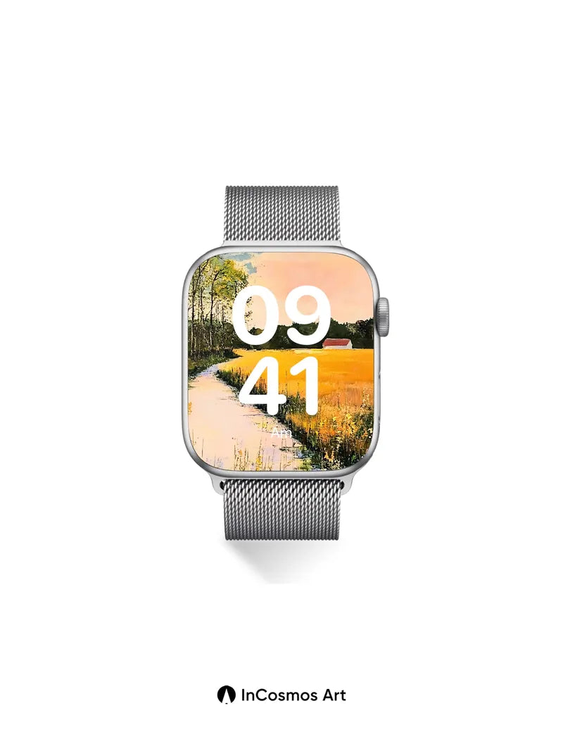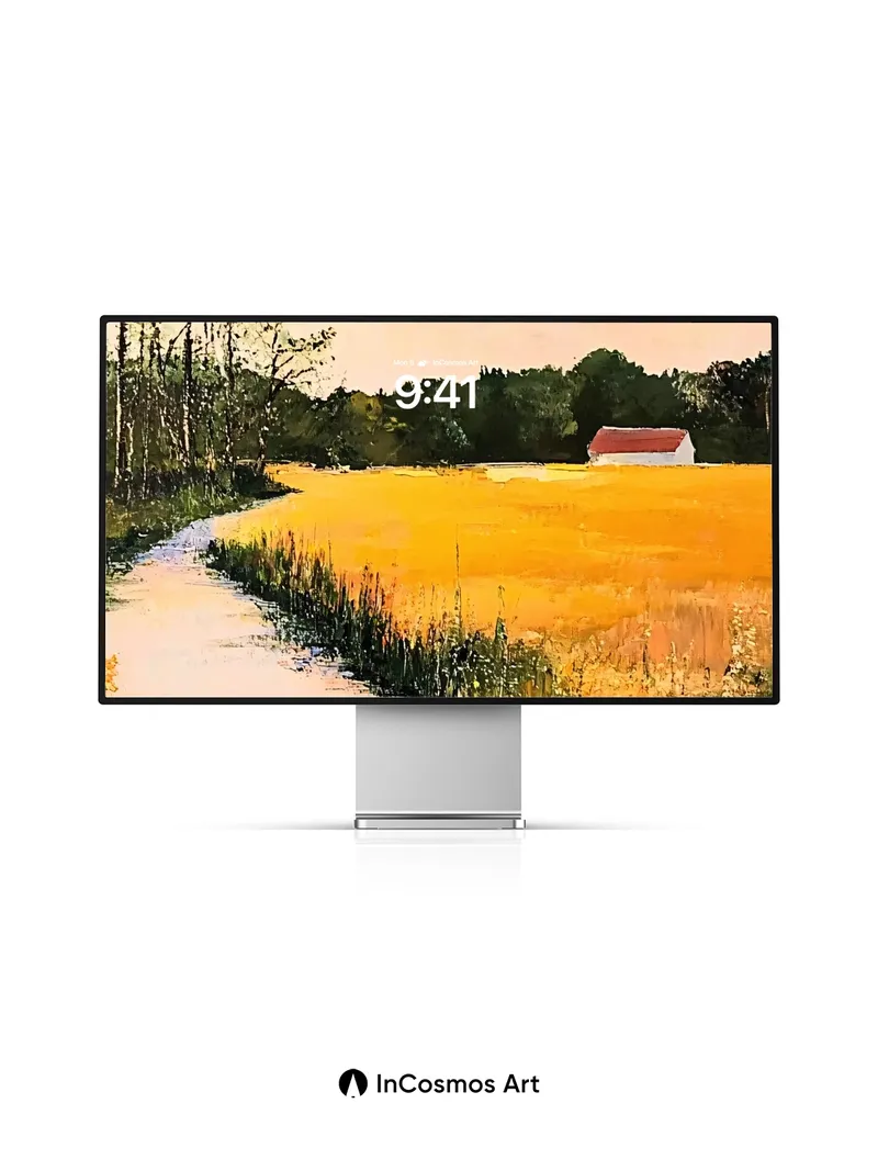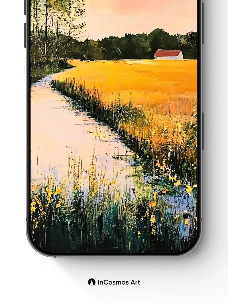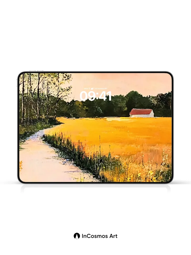 Debug product.metafields.custom.desc: Did you know that golden-hour light can make wheat fields shimmer like liquid honey? This scene captures the moment when sunbeams stretch across a quiet country road, painting long shadows and gilding wildflowers in the breeze. The path, worn soft by time, leads toward a distant red-roofed barn nestled beneath a sky that blushes from cerulean to rose—each stroke of color breathing warmth into the air.