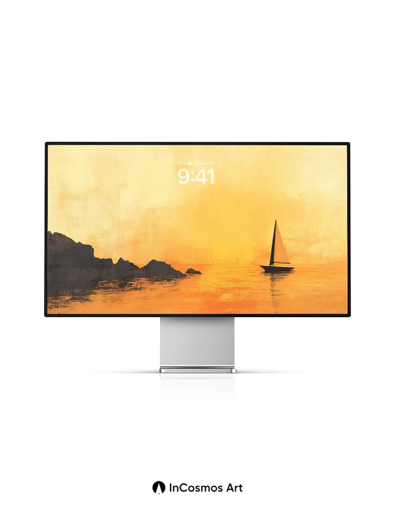 Debug product.metafields.custom.desc: Did you know the warmest hues of sunset are born from scattered sunlight filtering through atmospheric particles? This scene breathes in amber light, where a lone sailboat cuts through liquid gold, its silhouette framed by shadowed cliffs and a sky that feels like molten honey. The water mirrors the heavens not as a reflection, but as a second world—soft, shimmering, alive with quiet fire.
