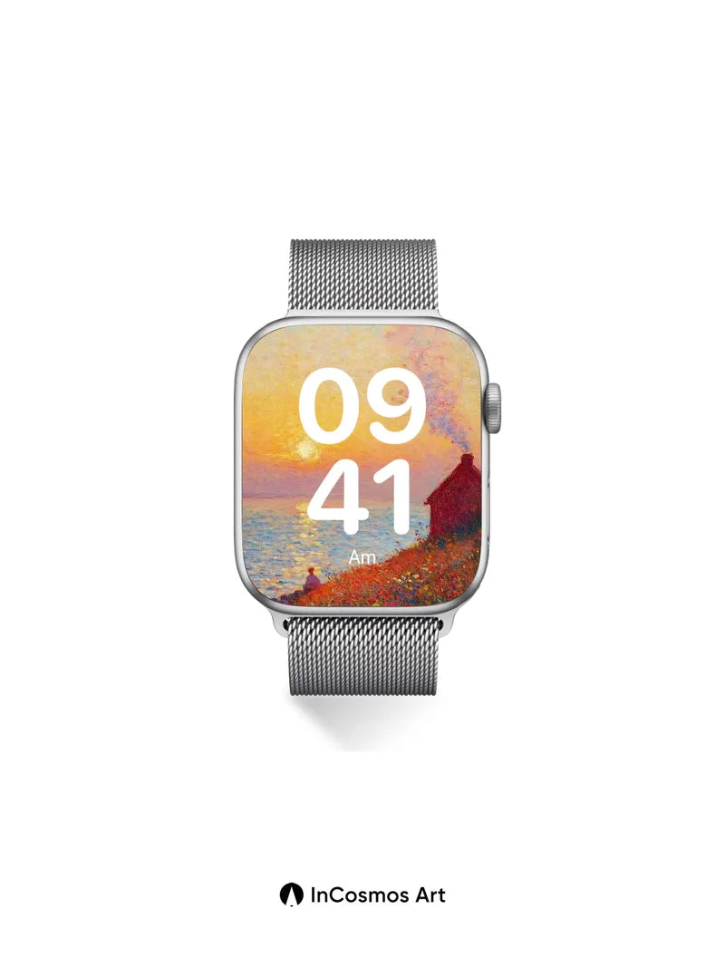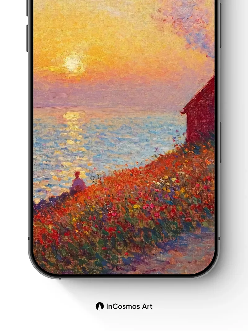 Debug page_description: Did you know Impressionist painters used broken color to capture light’s fleeting dance? Here, the sun bleeds gold across water like molten honey, while a solitary figure sits in a field of wildflowers that tremble under the breeze. A small cottage exhales smoke into the sky, its chimney drawing a soft line through pastel clouds—each brushstroke breathing warmth and stillness into the scene. Share this with your best friend. Send this to your love and swap a matching set. What if every sunset held a secret waiting to be remembered?