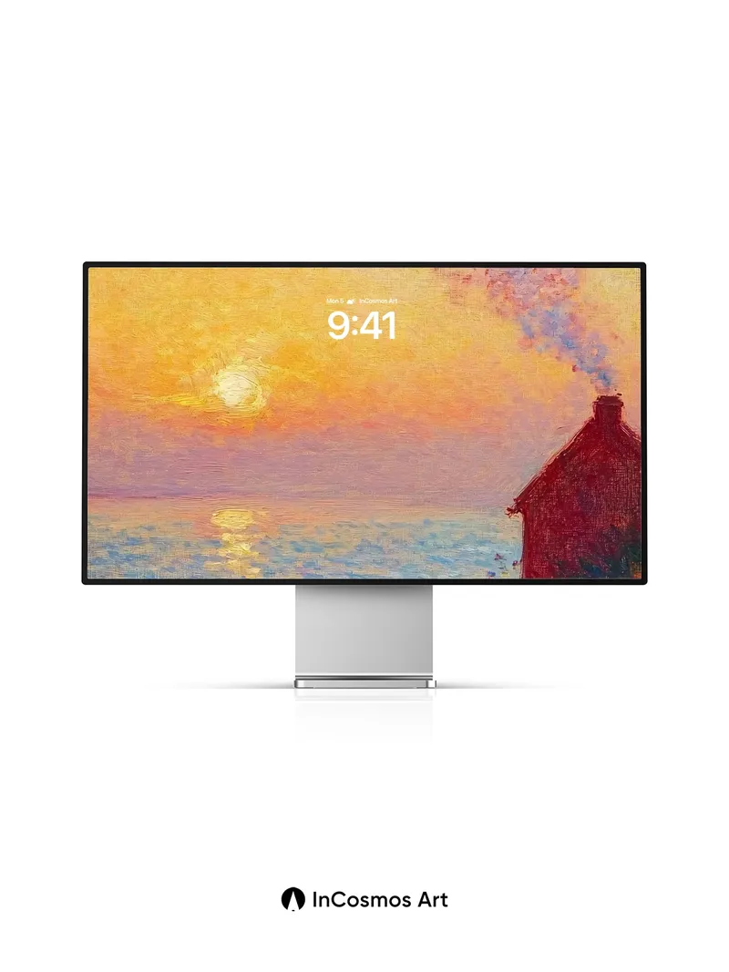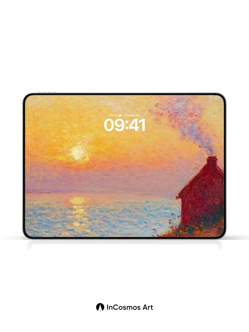 Debug product.metafields.custom.desc: Did you know Impressionist painters used broken color to capture light’s fleeting dance? Here, the sun bleeds gold across water like molten honey, while a solitary figure sits in a field of wildflowers that tremble under the breeze. A small cottage exhales smoke into the sky, its chimney drawing a soft line through pastel clouds—each brushstroke breathing warmth and stillness into the scene.