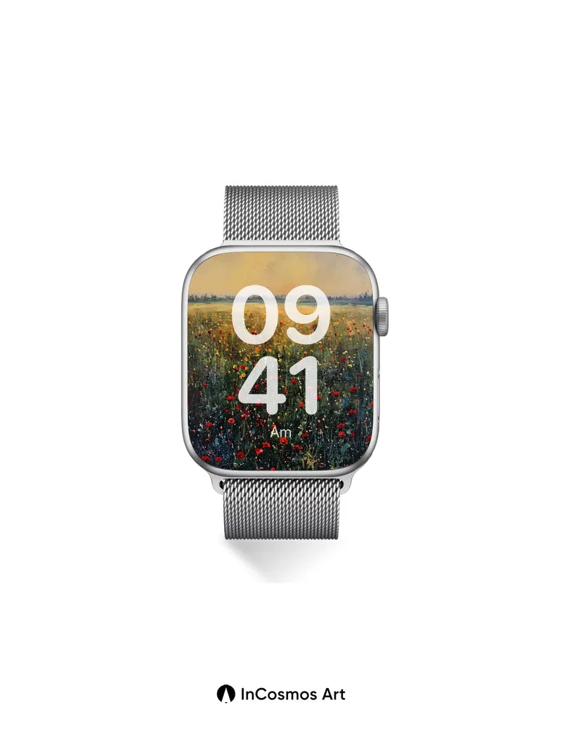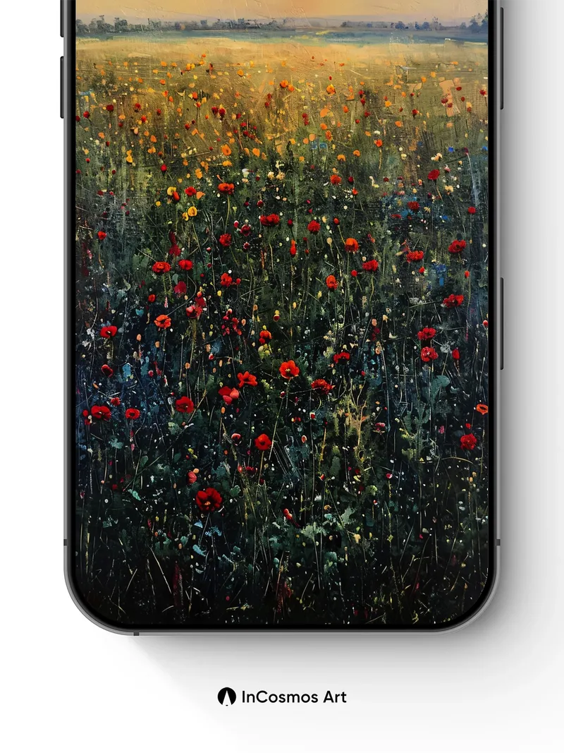 Debug product.metafields.custom.desc: Did you know poppies once grew in ancient Mesopotamian fields where farmers believed their red petals carried the breath of dawn? Here, they bloom like embers across a canvas of sun-warmed earth, each petal catching light as if it were a tiny flame flickering against dusk. The sky bleeds into gold and ash, softening the horizon into a dream that feels both ancient and alive.