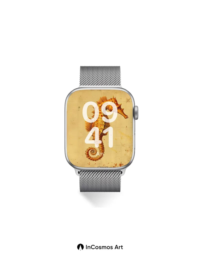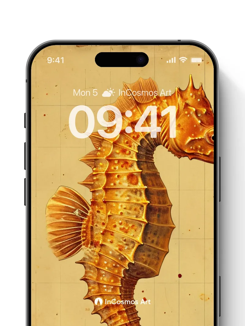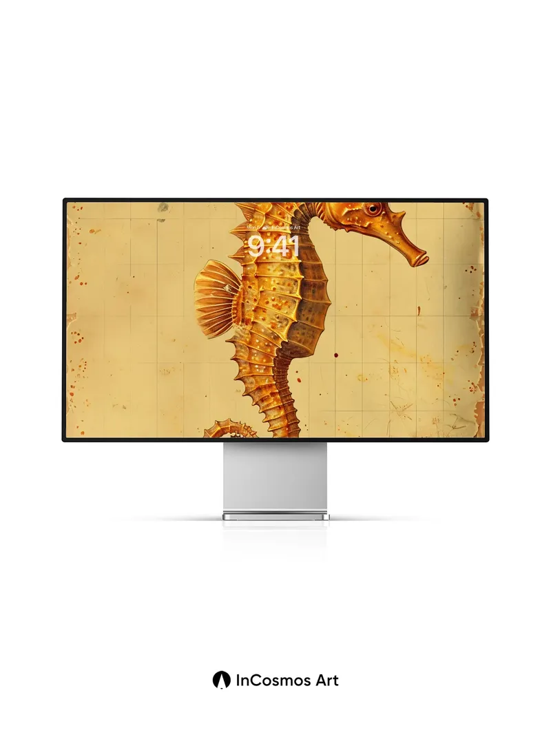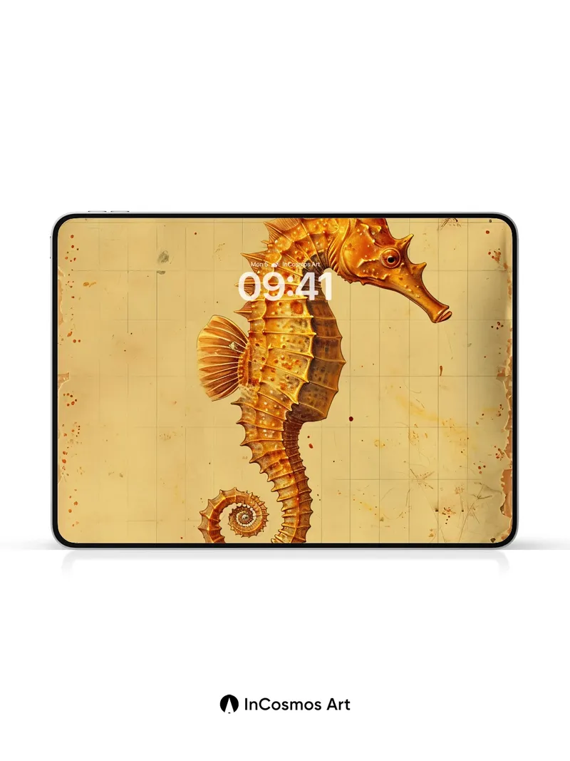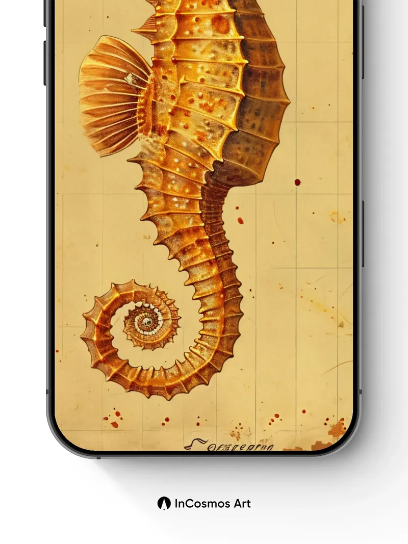 Debug product.metafields.custom.desc: Did you know seahorses are the only fish where males carry and give birth to offspring? This golden seahorse curls like a forgotten scroll, its armored spine catching light that dances across aged parchment, each scale etched with time’s quiet breath. The background hums with faded gridlines and rusted stains, as if this creature swam from a long-lost atlas of oceanic dreams.