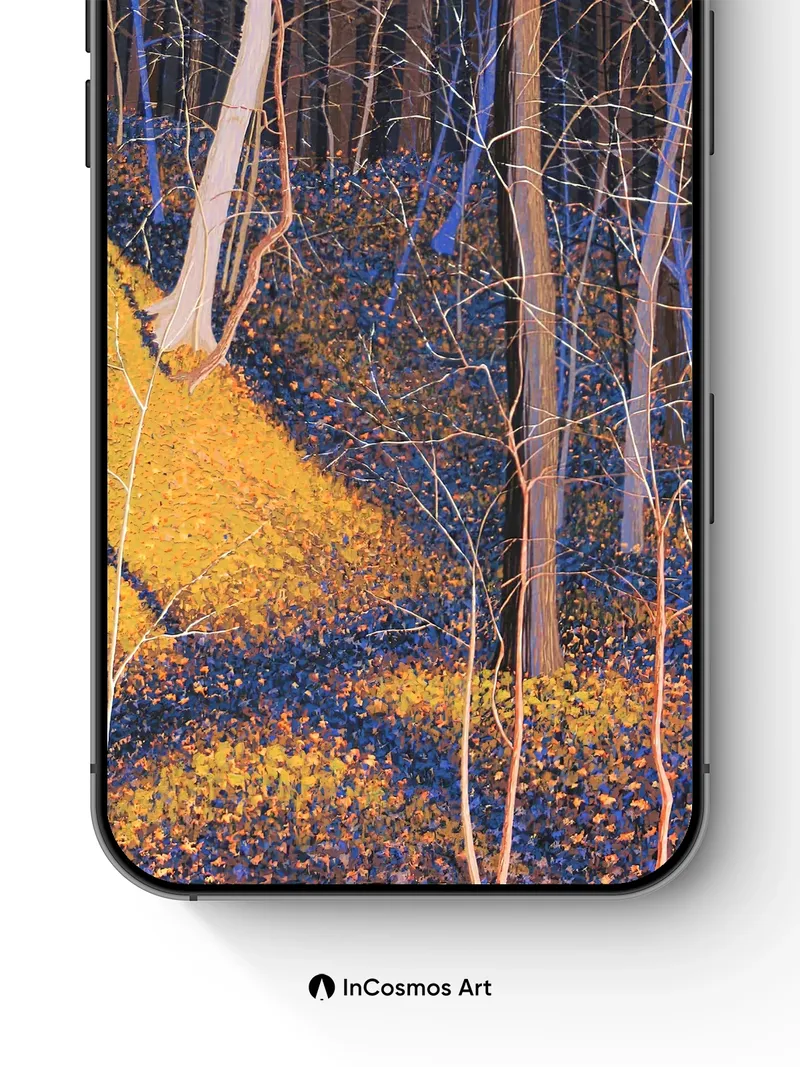 Debug product.metafields.custom.desc: Did you know that the dappled light in ancient woodlands once guided lost travelers by casting shifting patterns on mossy ground? Here, golden sunlight crawls over a carpet of fallen leaves like liquid honey, while bare birch trunks stand as silent sentinels in a twilight blue haze. The forest breathes through color—each shadow a memory, each branch a thread in nature’s vast tapestry.