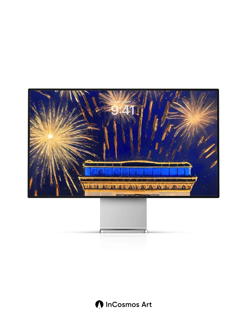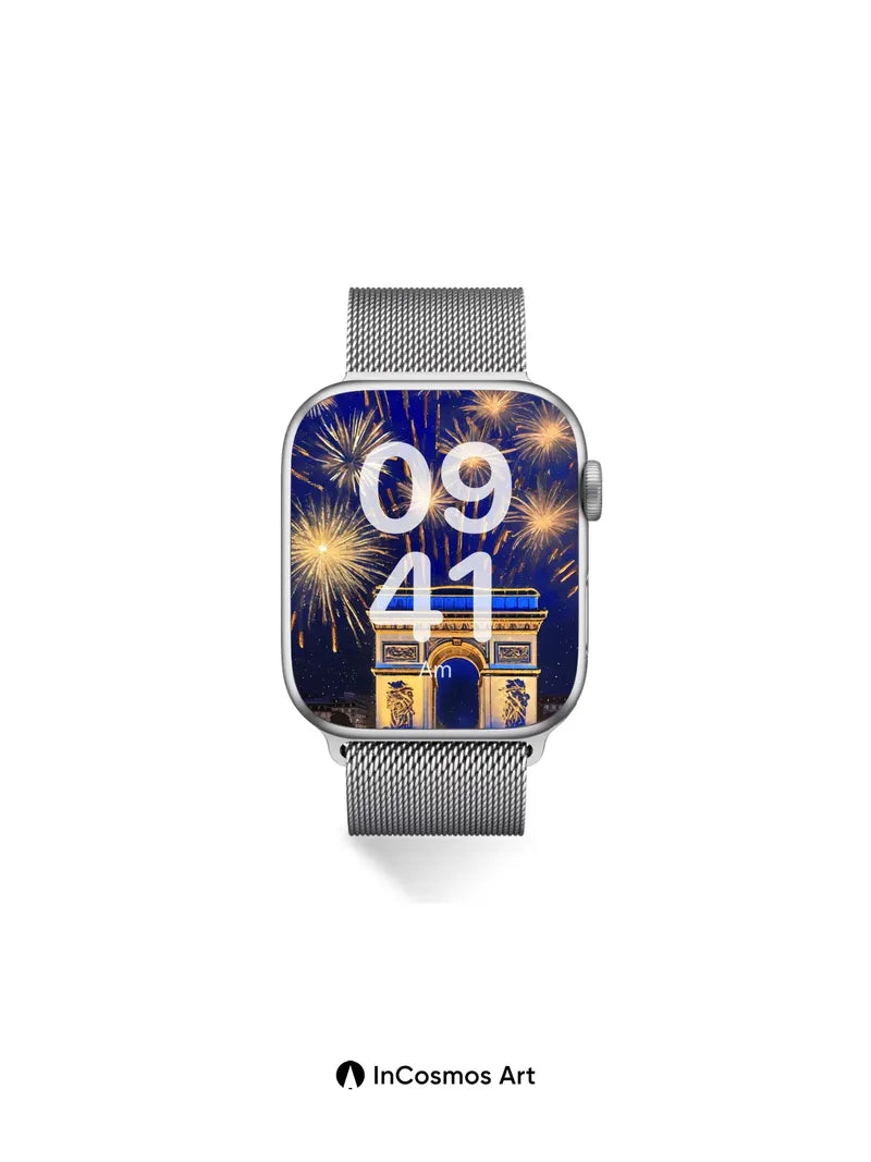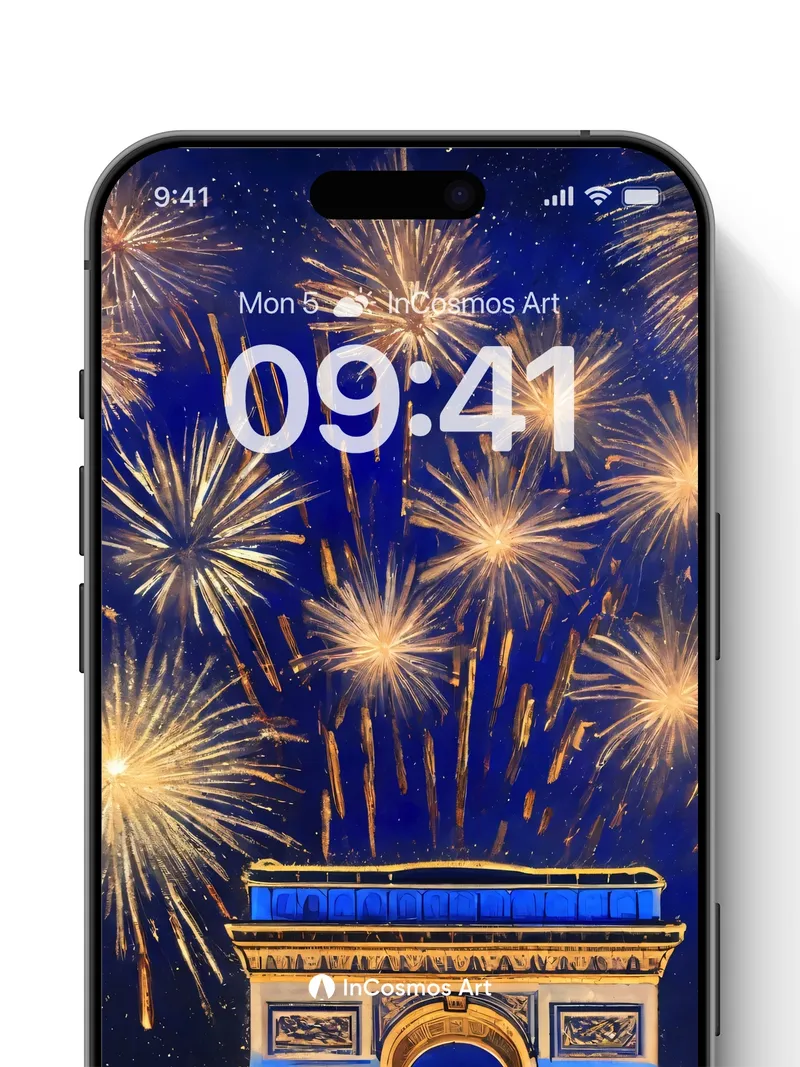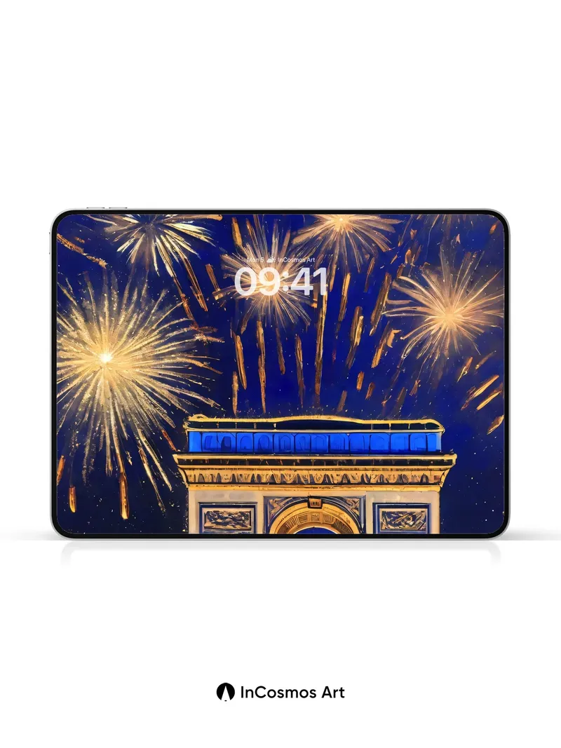 Debug product.metafields.custom.desc: Did you know the Arc de Triomphe was originally designed to honor Napoleon’s victories, yet now it stands beneath fireworks like a crown of light? The golden bursts cascade through the midnight sky, each spark reflecting off the monument's marble surface as if time itself is celebrating. You can almost hear the distant hum of city life and feel the cool air brush against your skin under this celestial spectacle.