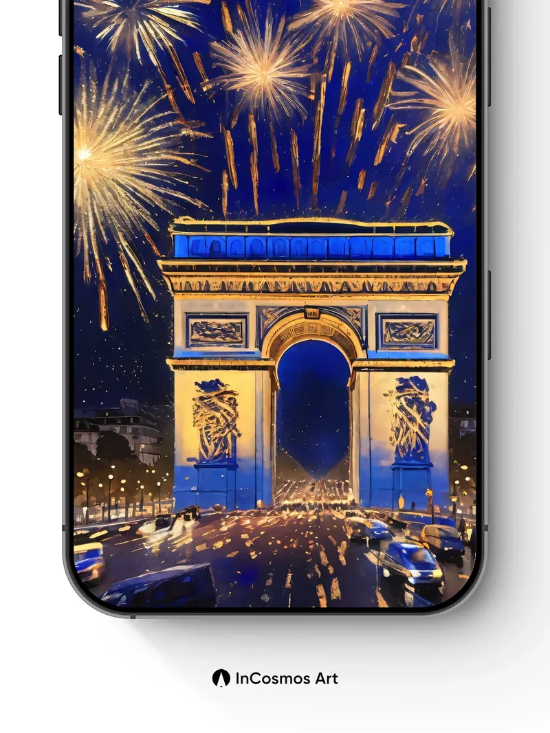Debug page_description: Did you know the Arc de Triomphe was originally designed to honor Napoleon’s victories, yet now it stands beneath fireworks like a crown of light? The golden bursts cascade through the midnight sky, each spark reflecting off the monument's marble surface as if time itself is celebrating. You can almost hear the distant hum of city life and feel the cool air brush against your skin under this celestial spectacle. Share this with your best friend. Send this to your love and swap a matching set. What if every night in Paris ended like this?