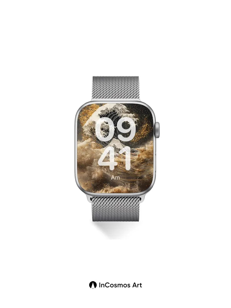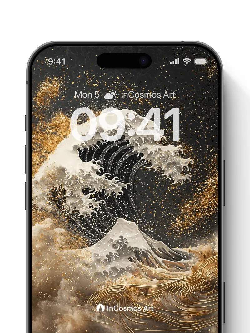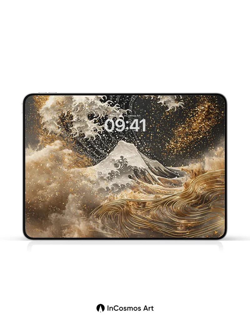 Debug product.metafields.custom.desc: Did you know the original Great Wave was painted in woodblock print using mineral pigments? Here, gold dust swirls like celestial foam over a wave that breathes in silver and shadow, its crest catching light like molten moonlight. Beneath it, Mount Fuji rises not in snow but in smoldering ash and gilded lines, as if the world itself is being rewritten in ink and fire.