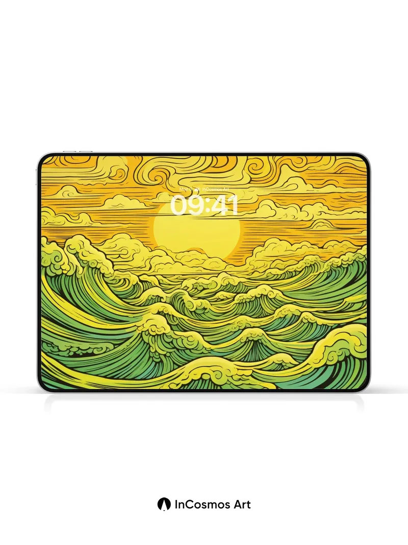 Debug page_description: Did you know the Japanese woodblock prints of the Edo period used hand-carved blocks to create waves that seemed to breathe? Here, the ocean swells in emerald curls under a sun-drenched sky, each crest painted with the precision of ancient masters. The light doesn’t just shine—it claws through the clouds like fire, turning every wave into a living sculpture of motion and memory. Share this with your best friend. Send this to your love and swap a matching set. What if the sea remembered every soul it carried?
