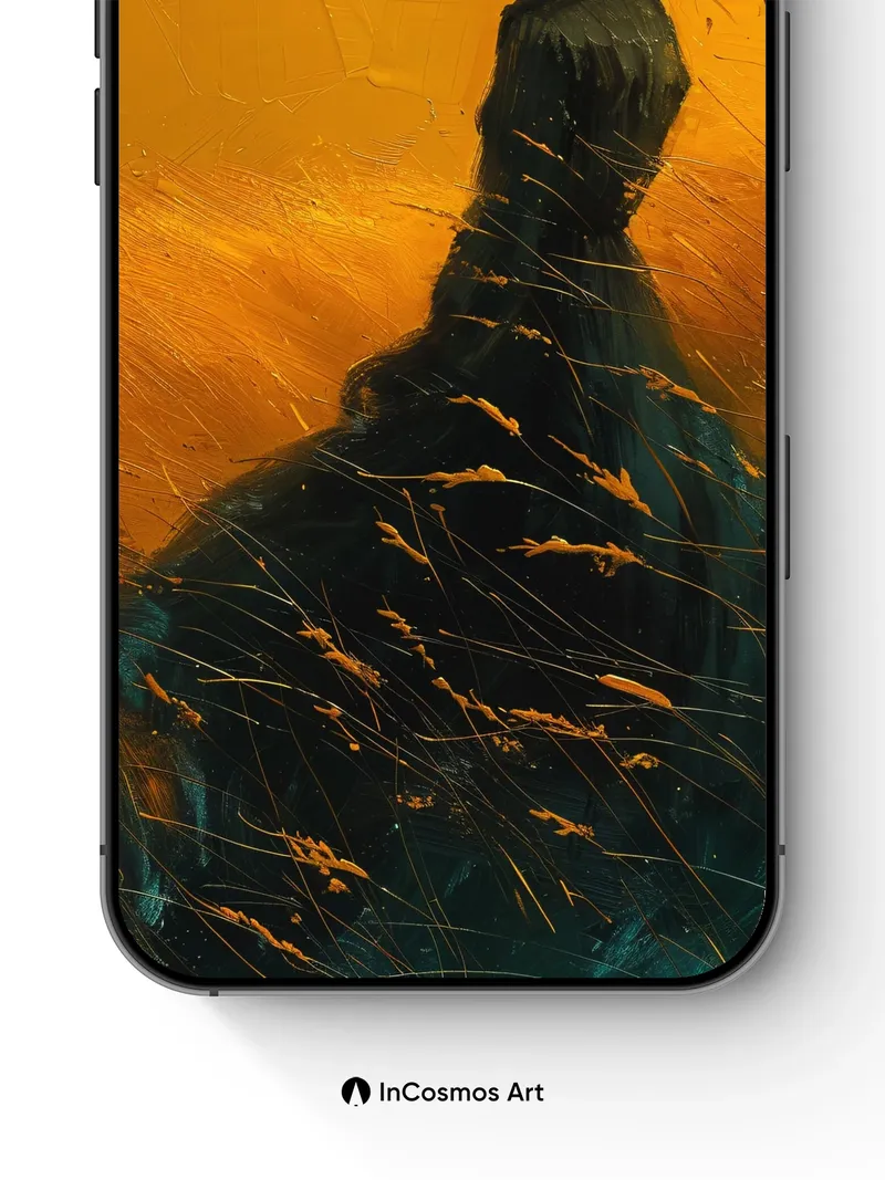 Did you know the color ochre was once made from ground earth and used in ancient cave paintings? Here, it breathes across a canvas like heat rising from desert sand, wrapping around a figure whose silhouette glides through time. Her dress drags through tall grasses, each blade catching firelight as if alive, while her hair streams behind her like a comet’s tail—unseen forces pulling her forward into a world painted in memory.