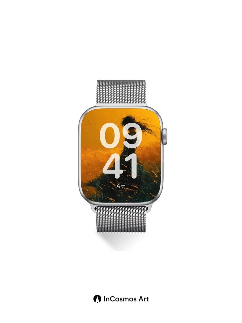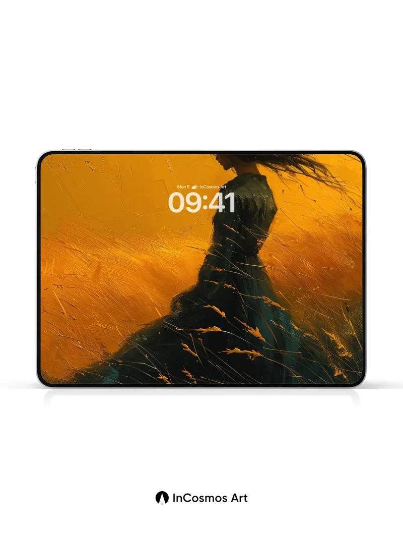Debug page_description: Did you know the color ochre was once made from ground earth and used in ancient cave paintings? Here, it breathes across a canvas like heat rising from desert sand, wrapping around a figure whose silhouette glides through time. Her dress drags through tall grasses, each blade catching firelight as if alive, while her hair streams behind her like a comet’s tail—unseen forces pulling her forward into a world painted in memory. Share this with your best friend. Send this to your love and swap a matching set. What would you whisper if the wind carried your words back in gold?