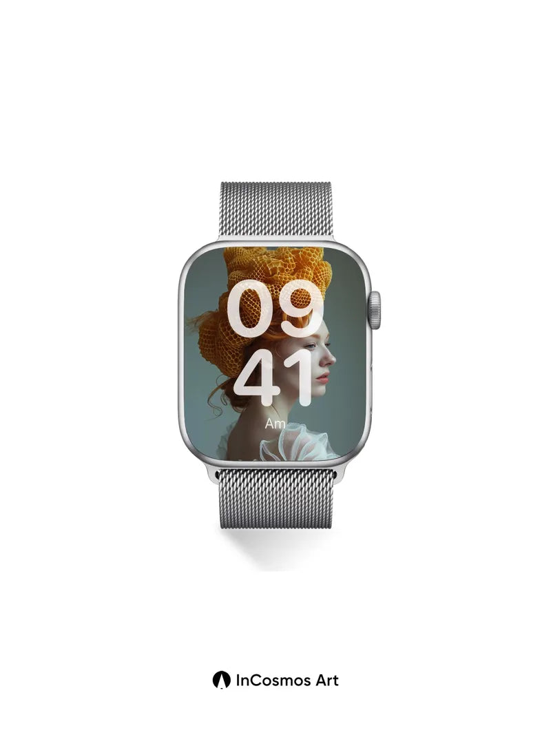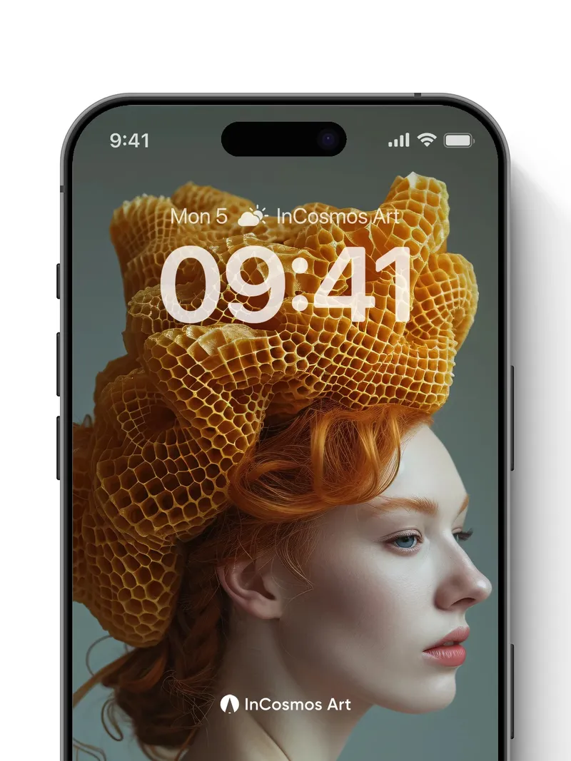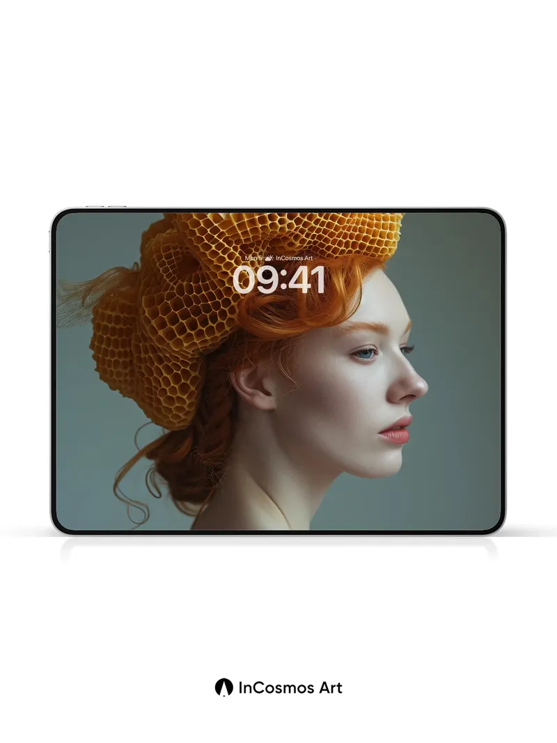 Debug page_description: Did you know bees build hexagonal cells to maximize space and strength? Here, golden honeycombs rise like sculpted waves above fiery red curls, their translucent lattice catching light that seems to breathe through each cell. The soft white tulle of the dress whispers against skin, a contrast of fragility and resilience, as if nature itself has woven a crown from sunlight and silence. Share this with your best friend. Send this to your love and swap a matching set. What if your hair could grow into architecture?