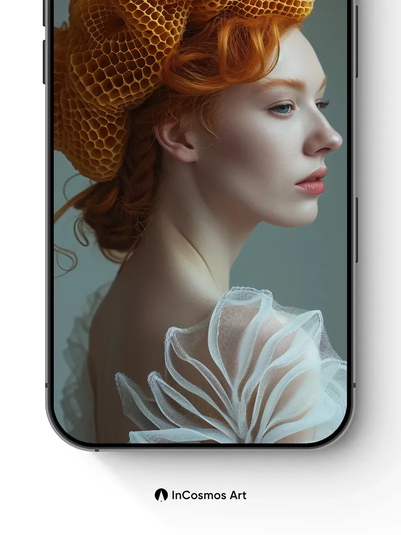 Did you know bees build hexagonal cells to maximize space and strength? Here, golden honeycombs rise like sculpted waves above fiery red curls, their translucent lattice catching light that seems to breathe through each cell. The soft white tulle of the dress whispers against skin, a contrast of fragility and resilience, as if nature itself has woven a crown from sunlight and silence.