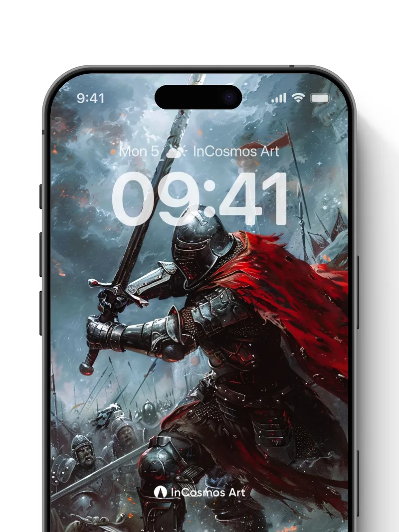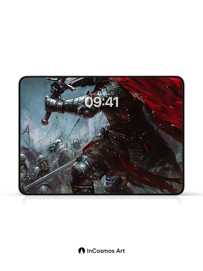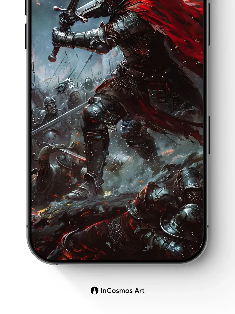 Debug page_description: Did you know medieval knights once forged their armor in the same fires that lit their banners? Here, steel breathes under storm-lit skies, its surface etched with battle scars and glowing embers. A crimson cloak flares like a wound in the wind, slicing through smoke and shadow as the knight strides over fallen warriors—each plate of armor reflecting the chaos above. Light crawls over metal, turning every dent into a story, every scar into a memory. Share this with your best friend. Send this to your love and swap a matching set. What if your walls could remember the weight of a sword?