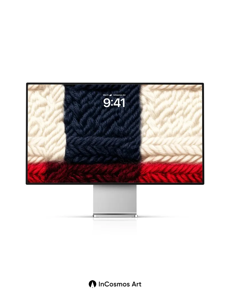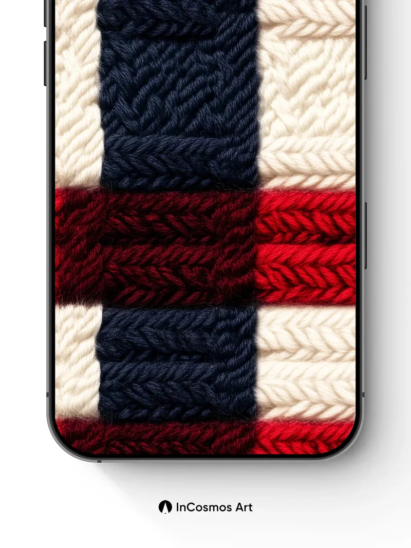 Debug og_description: Did you know hand-knit wool can trap sound like a living blanket? Here, each stitch hums with depth—red, navy, and cream threads weave a tactile grid that feels warm even under cool light. The pattern breathes in repeating squares, a quiet geometry that invites touch. You’ll find yourself tracing the ridges of the knit, drawn into its cozy rhythm like a lullaby stitched into fabric.