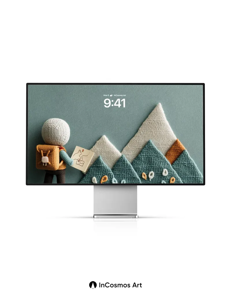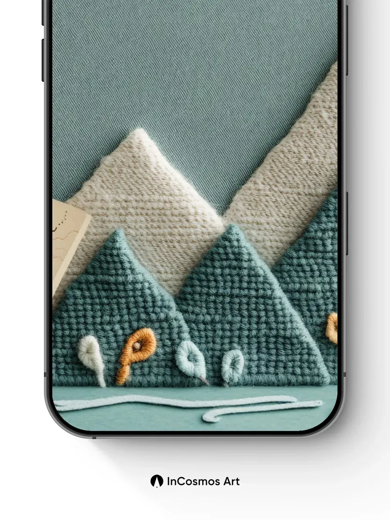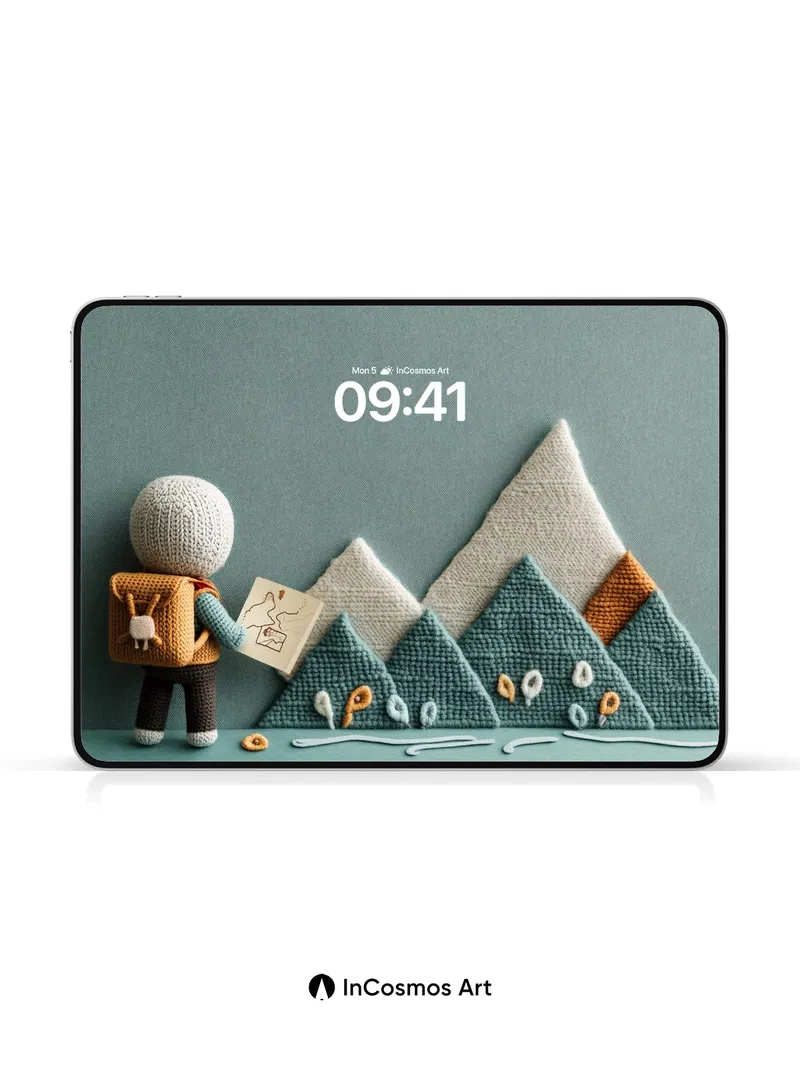 Knitted Mountain Adventure Wallpaper with Traveler Figure