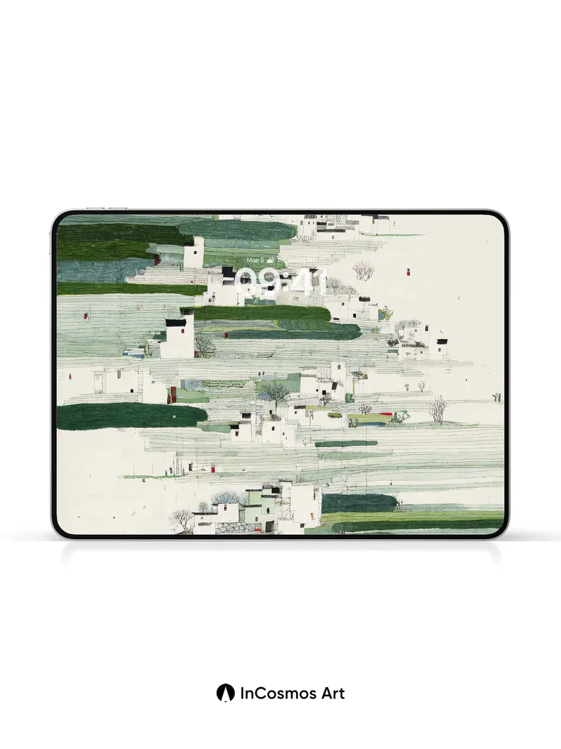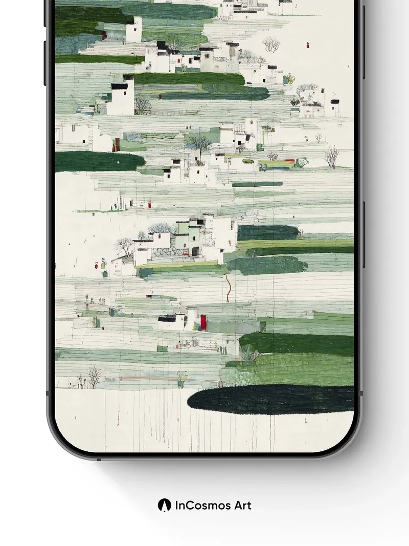 White houses nestle into terraced green slopes, creating a rhythmic pattern of habitation and agriculture. Did you know that terraced farming is one of the oldest methods of cultivation, dating back thousands of years? Share this with your best friend. Send this to your love and swap a matching set. Does this landscape evoke a sense of peaceful rural life for you?