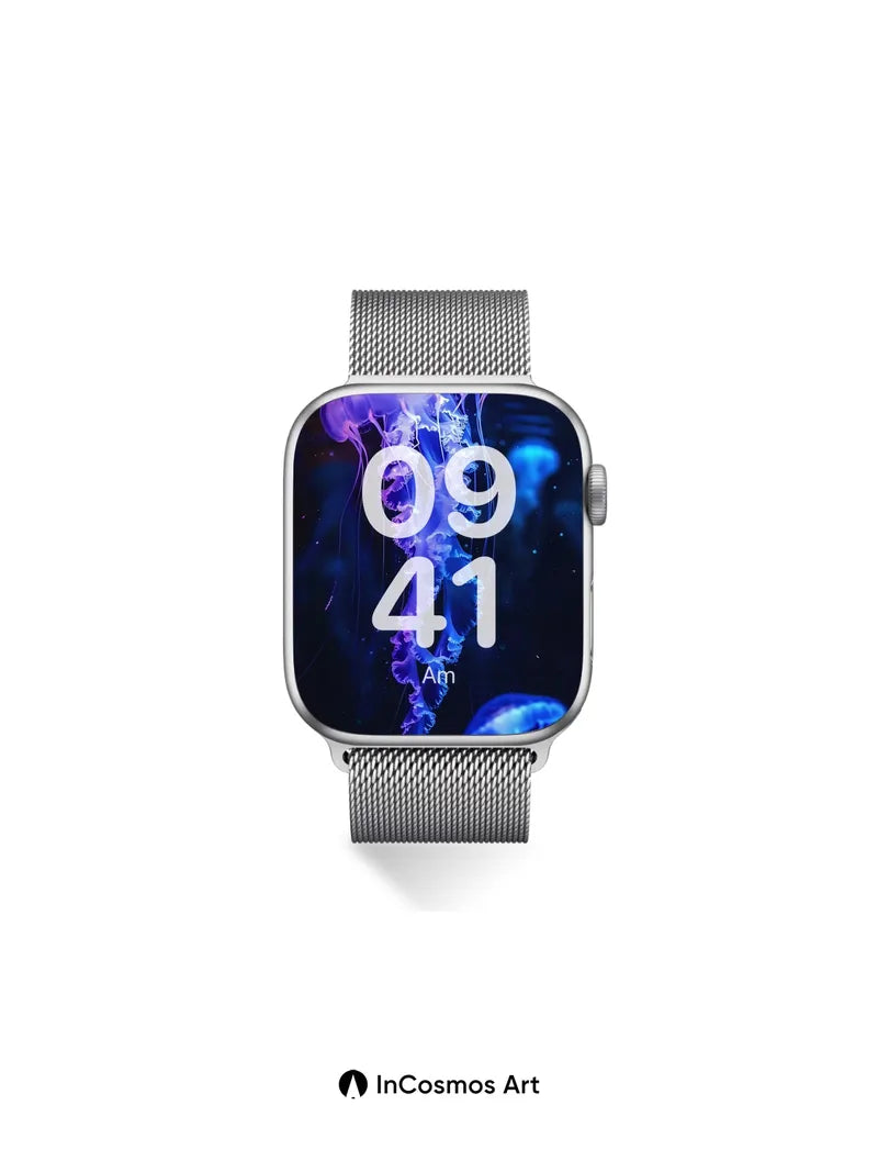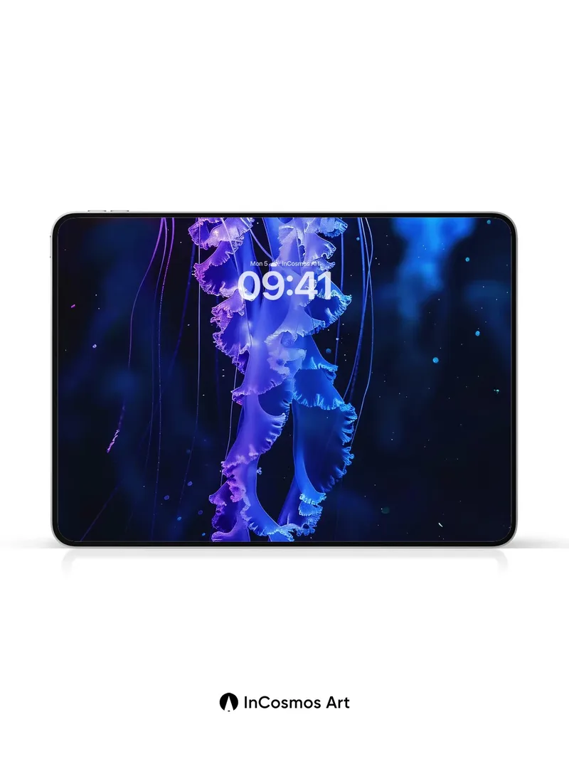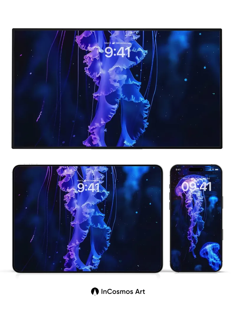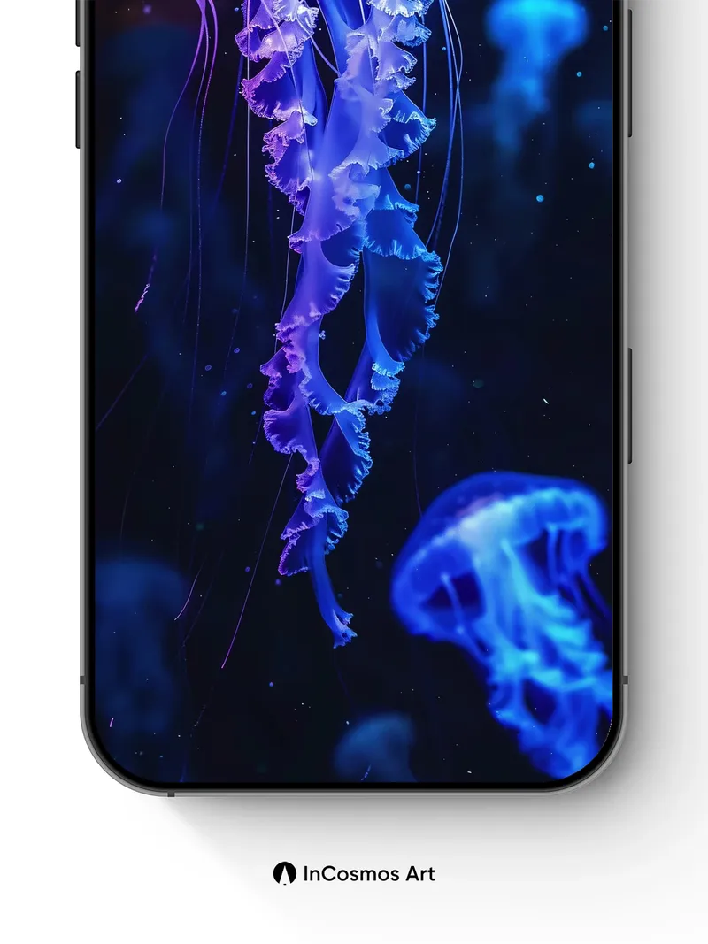 Debug product.metafields.custom.desc: Did you know jellyfish have existed for over 500 million years, predating dinosaurs? In this deep-sea vision, translucent bells pulse with electric violet and cerulean light, their trailing fronds like liquid lace floating through the dark. You can almost feel the cool silence of the ocean floor beneath your fingertips as each tentacle glows with inner fire, a living constellation drifting in eternal night.