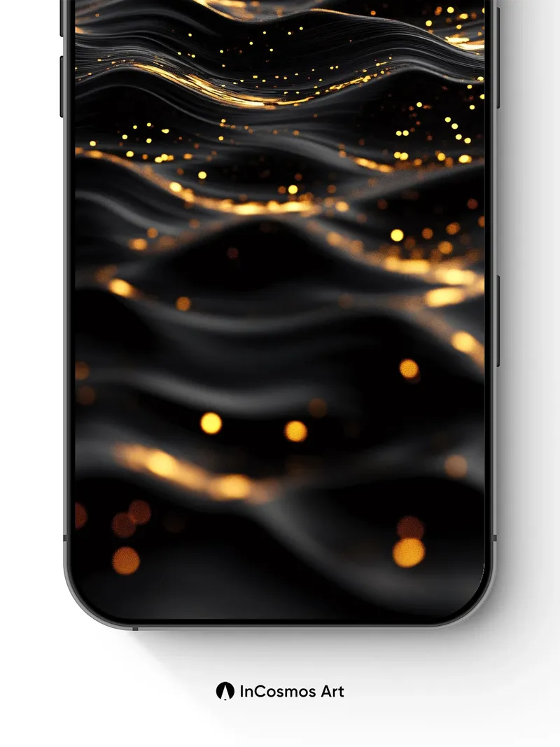 Debug og_description: Did you know that gold particles in ancient ink were once used to mimic celestial dust? Here, they drift like stardust across a velvet-black wavefield, each glimmer catching the light as if breathing. The surface undulates like liquid night, polished to a mirror sheen where warmth crawls over shadowed ridges—your eyes follow the current, drawn into a world where darkness holds more light than it hides.