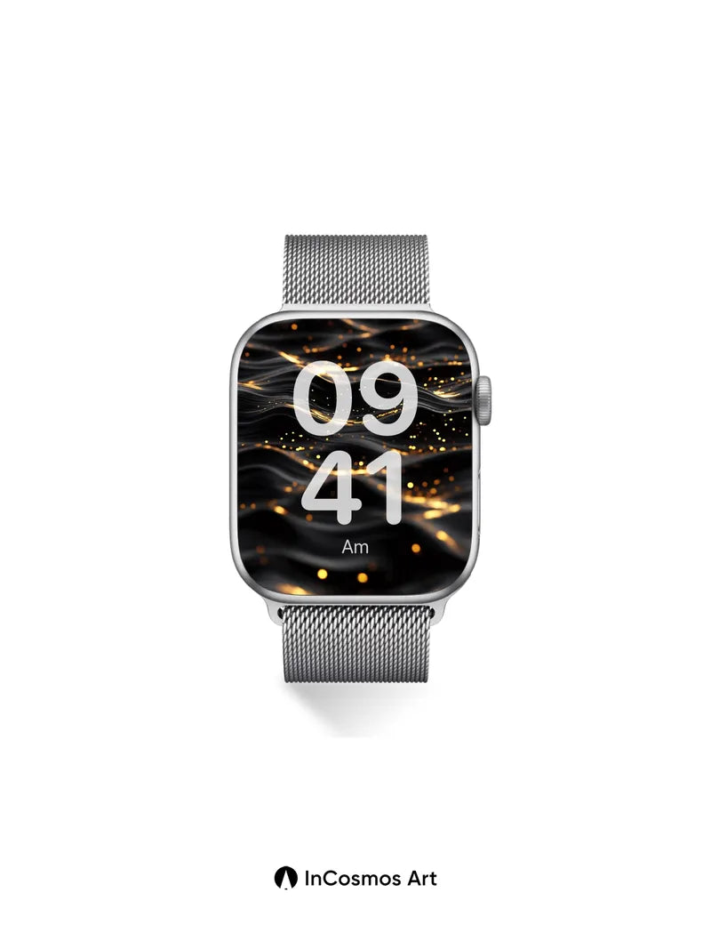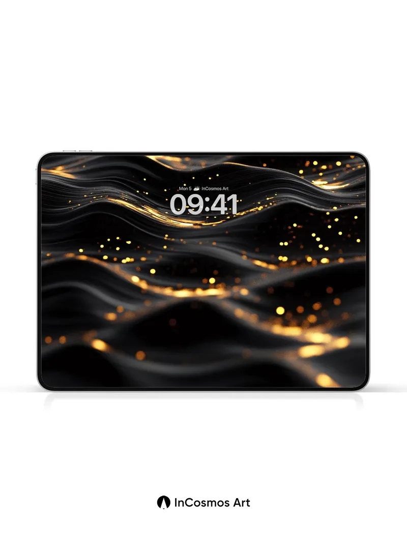 Debug page_description: Did you know that gold particles in ancient ink were once used to mimic celestial dust? Here, they drift like stardust across a velvet-black wavefield, each glimmer catching the light as if breathing. The surface undulates like liquid night, polished to a mirror sheen where warmth crawls over shadowed ridges—your eyes follow the current, drawn into a world where darkness holds more light than it hides. Share this with your best friend. Send this to your love and swap a matching set. What if the dark was never empty, but full of quiet stars waiting to be seen?