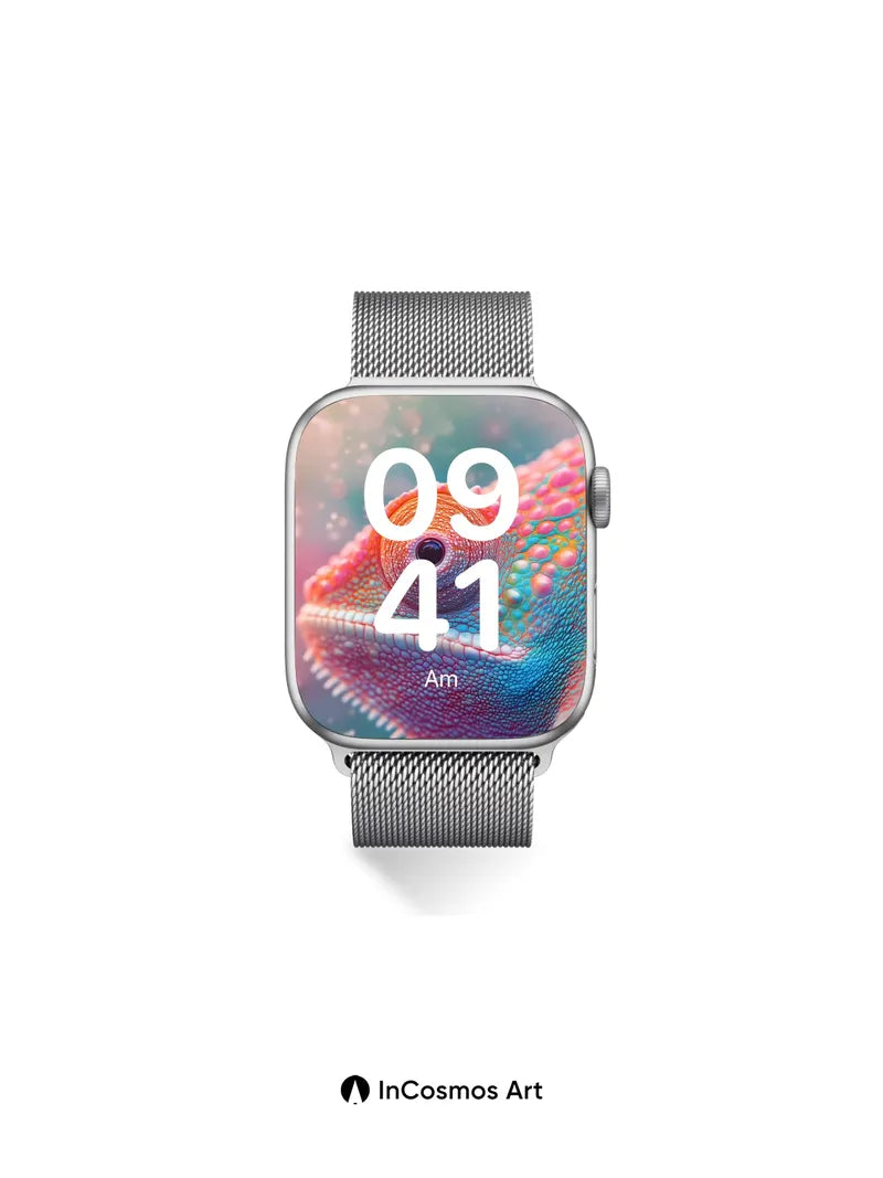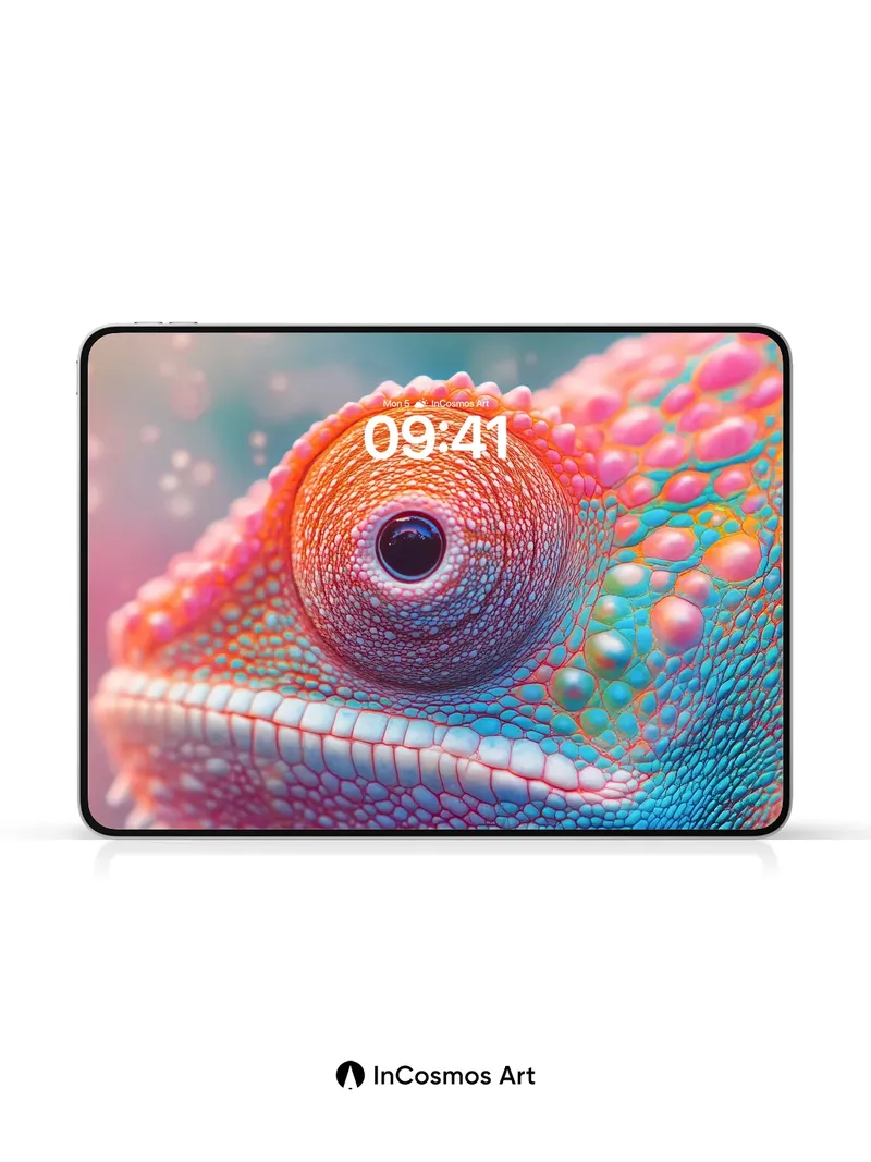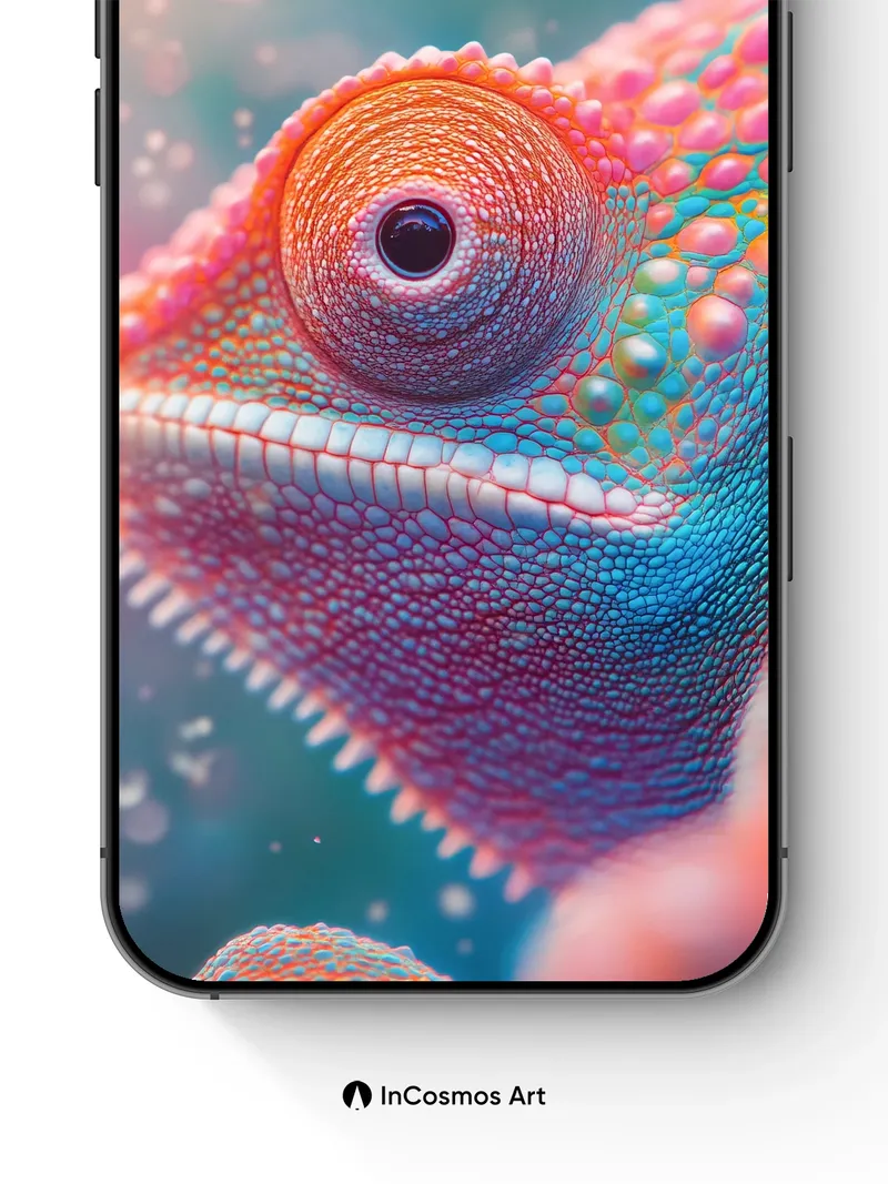 Debug page_description: Did you know chameleons change color not just for camouflage, but to communicate mood and temperature? This close-up reveals a living mosaic of iridescent scales that shimmer like liquid gemstones under soft, diffused light. Each tiny bump pulses with inner glow, as if the reptile’s skin breathes color. The eye, wide and watchful, holds a universe of focus—its dark pupil reflecting a world unseen by others. Share this with your best friend. Send this to your love and swap a matching set. What if your skin could paint the sky?