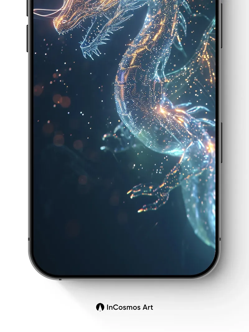 Did you know ancient myths once described dragons as celestial beings woven from stardust and silence? This digital dragon breathes light, its scales shimmering like constellations caught in motion, each particle a tiny sun flickering across midnight. You feel the warmth of its fire not in heat, but in the slow pulse of gold veins crawling through translucent skin—alive, electric, eternal.