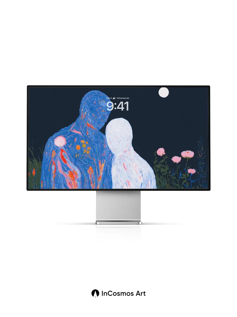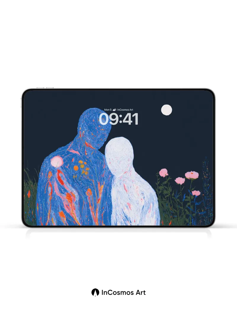 Debug product.metafields.custom.desc: Did you know the moon’s light can reflect off skin like a soft electric current? Here, two figures glow in quiet communion beneath a full moon, their forms painted in swirling veins of cerulean and coral as if breathing color into the night. The garden around them pulses with life—flowers unfurling like whispered secrets, petals catching the silver haze. You feel not just seen, but sensed.