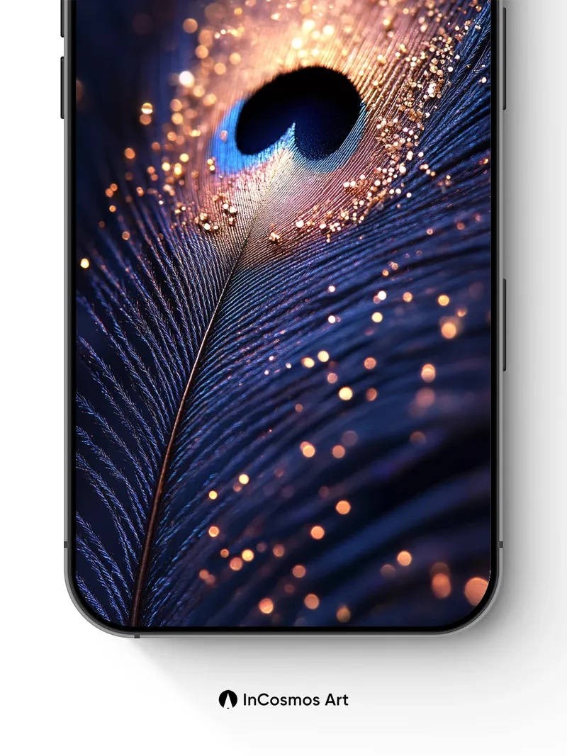 Debug product.metafields.custom.desc: Did you know peacock feathers reflect light through microscopic structures, creating iridescent hues without pigment? Here, each barb glows like a constellation, dusted with golden particles that shimmer as if breathing in the dark. The eye of the feather pulses with deep indigo and electric blue, surrounded by a halo of warm sparks that dance across the surface like stardust caught in time.